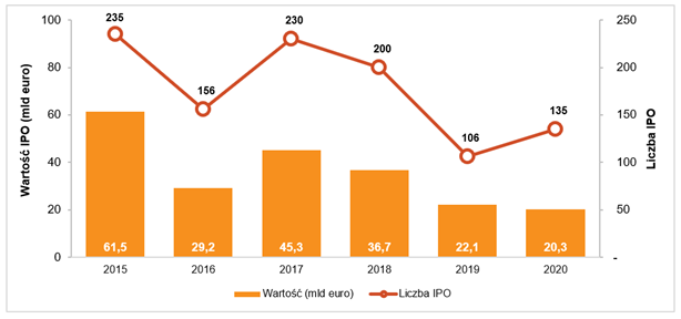 Zgodnie z danymi uzyskanymi przez PwC, łączna wartość IPO w Europie w 2020 roku wyniosła 20,3 mld euro i spadła w porównaniu do poprzedniego roku o 1,8 mld euro. Na europejskich parkietach zadebiutowało 135 spółek (wobec 106 w 2019 roku).