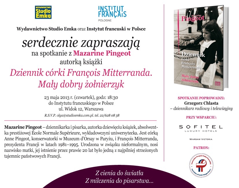 <p style="text-align: justify;">Wydawnictwo Studio EMKA we współpracy z Instytutem francuskim w Polsce serdecznie zapraszają na spotkanie z Mazarine Pingeot autorką książki Dziennik córki François Mitterranda. Mały dobry żołnierzyk 23 maja 2013 r. (czwartek), godz: 18:30 do Instytutu Francuskiego na ul. Widok 12.</p>