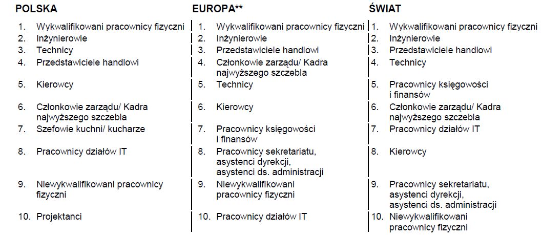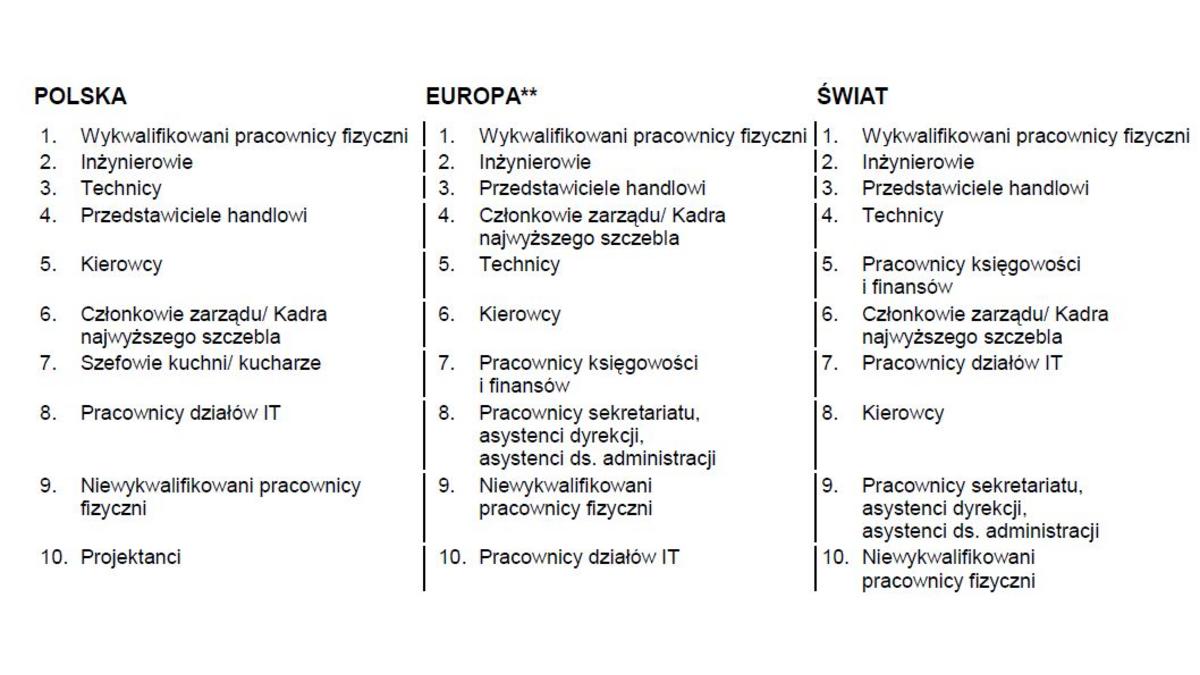 Podobnie jak w Polsce w ci?gu ostatnich edycji badania zawody, na które jest największy popyt w Europie oraz na świecie prawie nie uległy zmianie. Pracodawcy niezmiennie poszukuj? wykwalifikowanych pracowników fizycznych, inżynierów, przedstawicieli handlowych oraz techników.