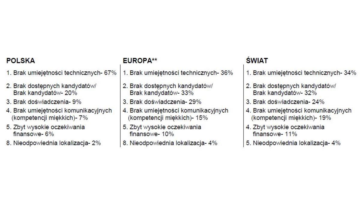 Trudności w obsadzaniu stanowisk z powodu braku dostępnych talentów deklaruje co pi?ty pracodawca w naszym kraju (20%). Jako trzeci czynnik, rodzimi pracodawcy najczęściej podawali brak doświadczenia kandydatów (9%).