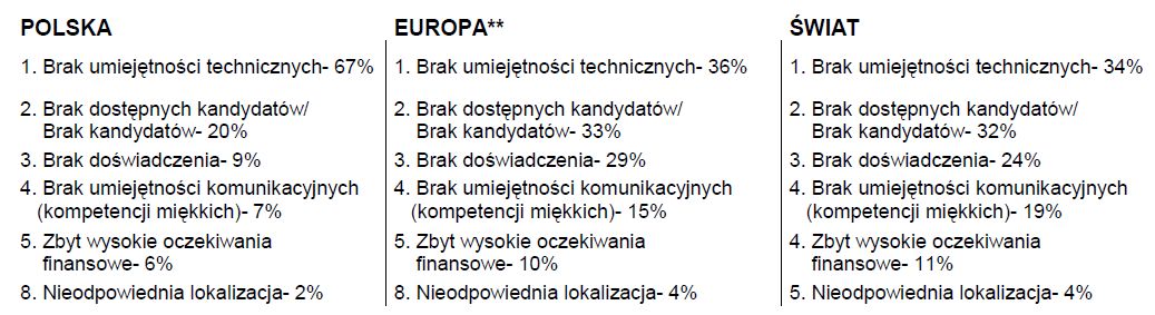 W badaniu poproszono również respondentów o wskazanie przyczyn niedoboru talentów. Duże znaczenie dla wszystkich firm dotkniętych tym problemem, niezależnie od tego, jakiej kategorii dotyczy oraz w jakiej części świata działa, maj? czynniki środowiskowe i organizacyjne. Najważniejsz? przyczyn? trudności w rekrutacji okazał się być brak umiejętności technicznych, który szczególnie silnie odczuwany jest przez pracodawców w Polsce (67%).
