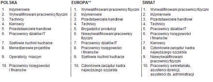 Podobnie jak w Polsce w ci?gu ostatnich edycji badania zawody, na które jest największy popyt w Europie oraz na świecie prawie nie uległy zmianie. Od pięciu lat pracodawcy niezmiennie poszukuj? wykwalifikowanych pracowników fizycznych, inżynierów, przedstawicieli handlowych oraz techników.