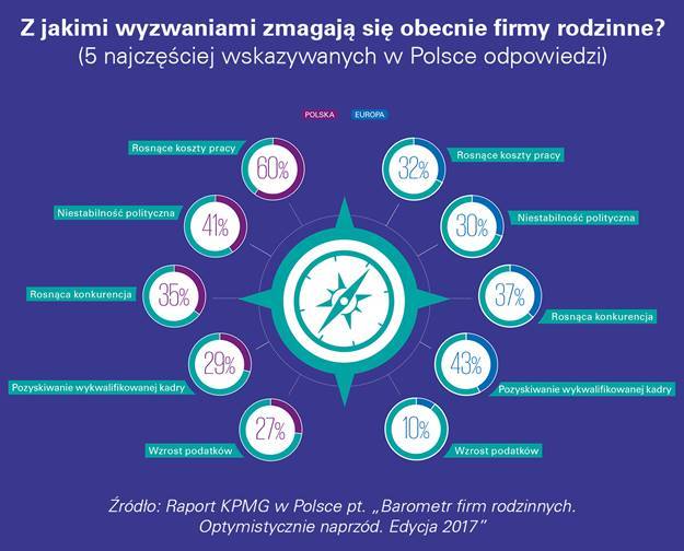 Jeszcze do niedawna koszty pracy w Polsce należały do jednych z niższych w Europie, jednak od kilku lat ich wysokość ulega zmianie. Przedstawiciele firm rodzinnych w Polsce istotnie odczuwaj? zwiększaj?ce się koszty zatrudnienia – dla ponad połowy badanych stanowi? one duże utrudnienie w prowadzeniu biznesu. Istotnym wyzwaniem dla polskich przedsiębiorców jest także otoczenie prawne oraz poziom jego skomplikowania. Ankietowane firmy rodzinne w Polsce – zapytane o czynniki, które przyczyniłyby się do lepszej sytuacji ich biznesów – wskazuj? między innymi na bardziej elastyczne regulacje dotycz?ce rynku pracy (18%) – mówi Piotr Żurowski, partner w KPMG w Polsce.