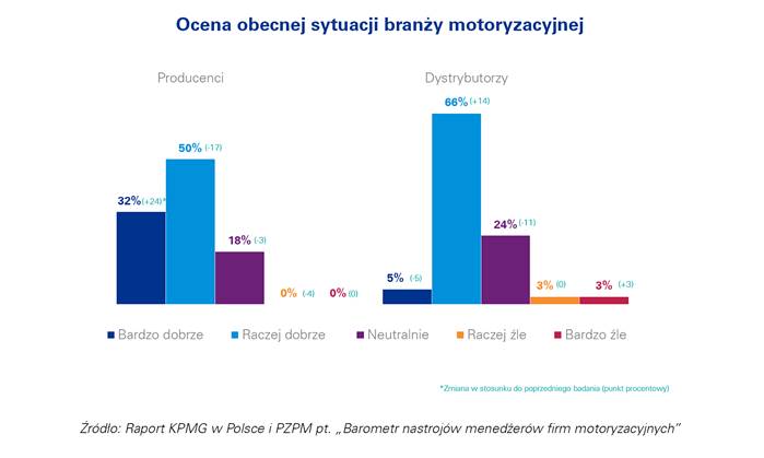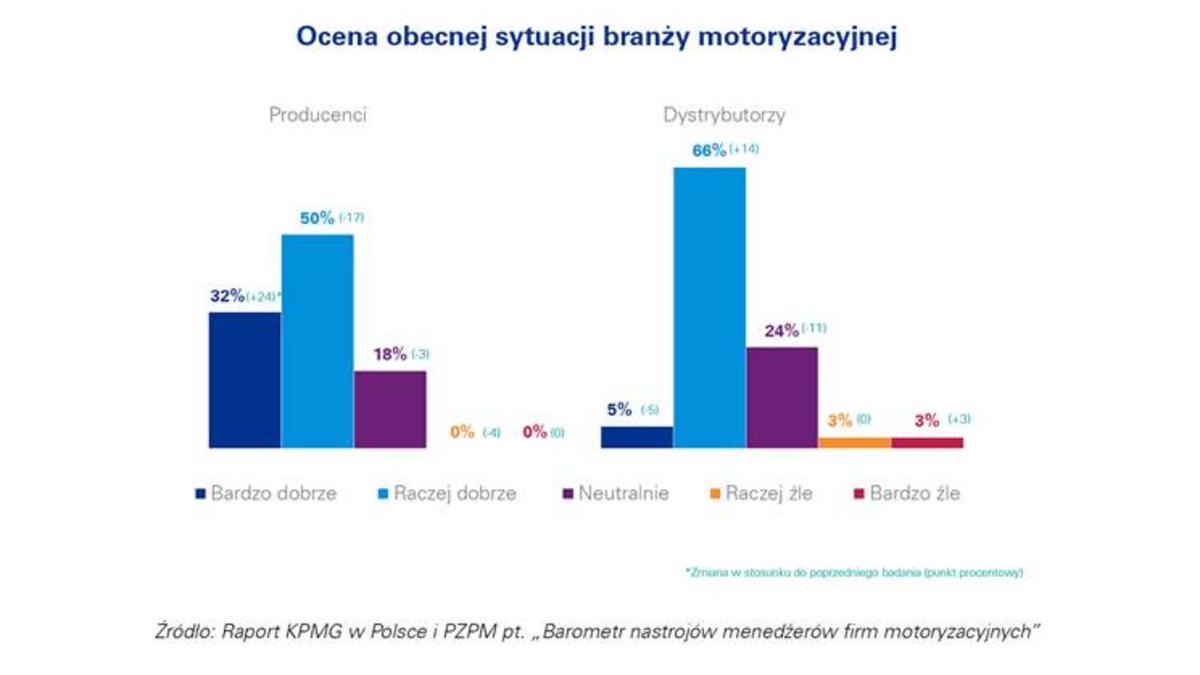 Jak wynika z badania KPMG i PZPM, przedstawiciele producentów i dystrybutorów firm motoryzacyjnych nie spodziewaj? się również większych zmian sytuacji gospodarczej w kraju. 58% dystrybutorów i 64% producentów uważa, że sytuacja gospodarcza Polski pozostanie bez zmian w ci?gu następnych 12 miesięcy.
