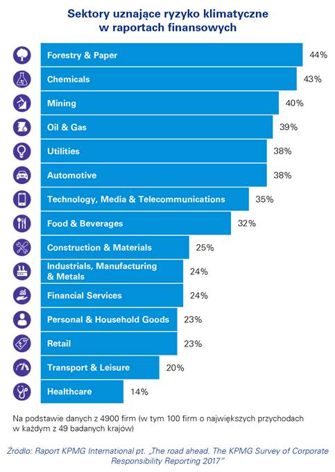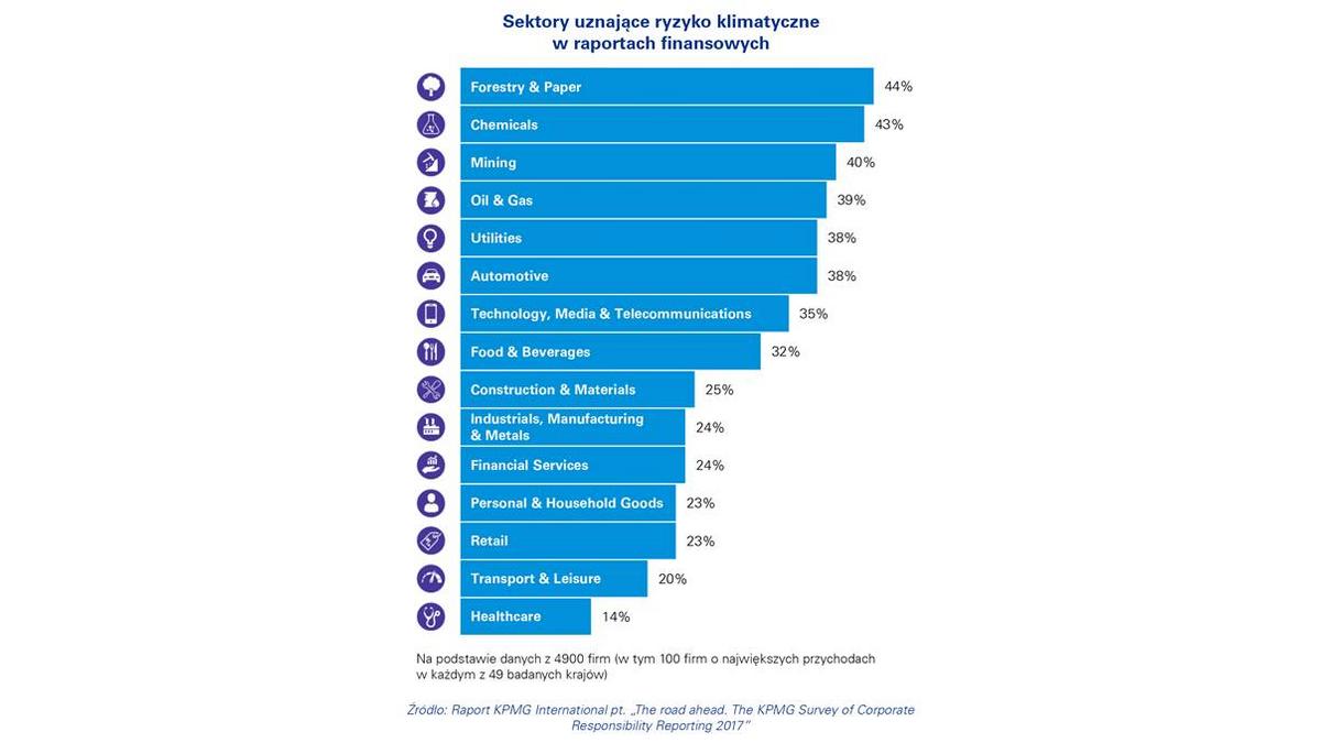 Z raportu KPMG wynika, że spośród największych światowych firm tylko nieliczne dostarczaj? inwestorom wymierne informacje na temat ryzyka podyktowanego zmianami klimatycznymi. Krajami, w których większość analizowanych przedsiębiorstw wspomina w swoich sprawozdaniach finansowych o ryzyku wynikaj?cym ze zmian klimatycznych s?: Tajwan (88%), Francja (76%), Republika Południowej Afryki (61%), USA (53%) i Kanada (52%). W większości przypadków, ujawnione ryzyko zwi?zane z klimatem wynika z regulacji prawnych, ale również silnej presji ze strony rz?du, giełdy lub regulatora finansowego. Dokonuj?c klasyfikacji ze względu na branżę, w której odsetek zawieranych informacji o ryzyku zwi?zanym ze zmianami klimatu jest najwyższy, można wyróżnić leśnictwo i przemysł papierniczy (44%), przemysł chemiczny (43%), górniczy (40%) i petrochemiczny (39%). W najmniejszym stopniu takie ryzyko dostrzegaj? przedsiębiorstwa działaj?ce w handlu detalicznym (23%), transporcie i rekreacji (20%) i w sektorze ochrony zdrowia (14%).