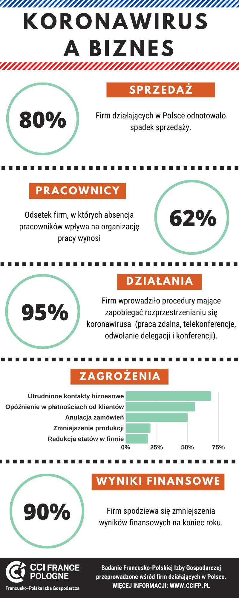 Badanie „Wpływ koronawirusa na działalność firm w Polsce” zostało przeprowadzone przez Francusko-Polską Izbę Gospodarczą wśród firm stowarzyszonych i skierowane było do Prezesów, Dyrektorów Generalnych, Finansowych i Prawnych. Udział w nim wzięło 118 przedsiębiorstw działających w Polsce, z czego 35% to firmy polskie, 58% francuskie, a 7% z kapitałem pochodzącym z innych krajów. Połowa respondentów reprezentowała firmy zatrudniające do 50 osób, 29% to średnie przedsiębiorstwa (51 – 500 pracowników), a 23 % do firmy zatrudniające powyżej 500 osób. 58% firm biorących udział w badaniu świadczy usługi B2B, 25% zajmuje się sprzedażą w segmencie B2B i B2C, a 15% respondentów to firmy produkcyjne.