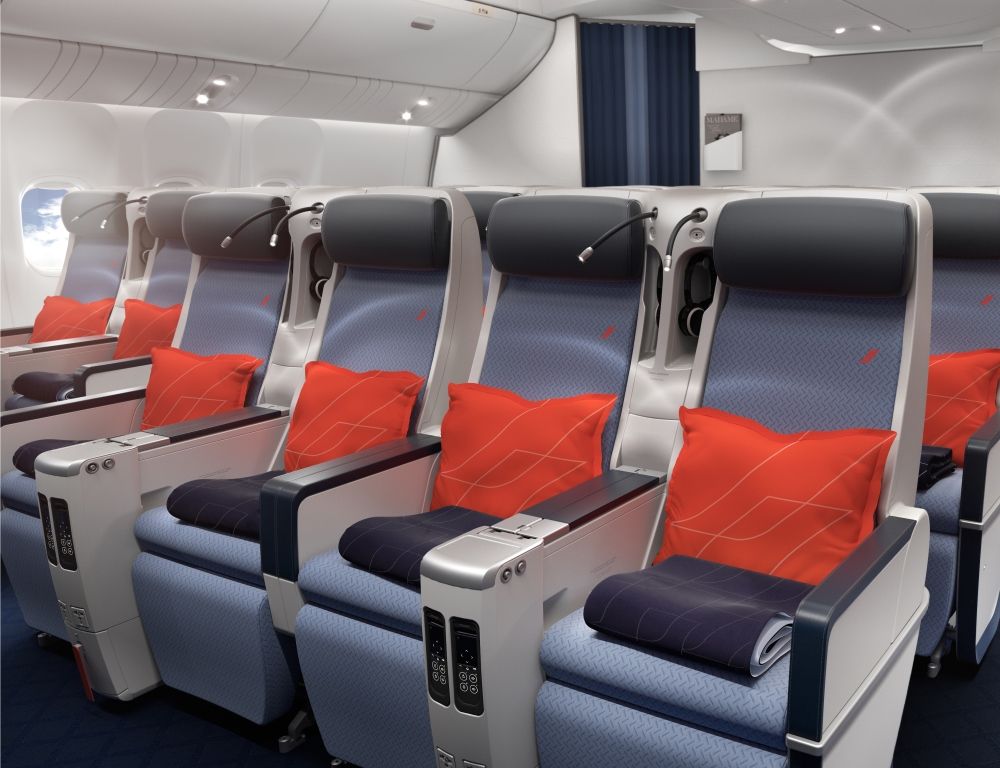 Kabina Premium Economy została wyposażona w nowe fotele, które mają spełniać najwyższe standardy komfortu, oferując siedzisko o szerokości 48,8 cm i odchylenie oparcia do 130 stopni w ramach sztywnej obudowy fotela, dzięki czemu podróżni nie naruszają wzajemnie swojej prywatnej przestrzeni. Miękkie siedzenia posiadają specjalne, ergonomiczne wsparcie lędźwiowe, szersze niż dotychczas skórzane podłokietniki, dodatkową przestrzeń dla nóg, a także ruchome zagłówki i podnóżki. Otoczenie kabiny Premium obejmuje dodatkowo nowe schowki bagażowe, indywidualną regulowaną lampkę do czytania, podstawkę na tablet, gniazdko zasilania i dwa porty USB. Każdy klient otrzymuje słuchawki z redukcją szumów, aby cieszyć się szeroką gamą rozrywki dostępnej na indywidualnym ekranie HD o przekątnej 13,3 cala. A dla dodatkowej wygody, przy każdym fotelu znajduje się zestaw akcesoriów podróżnych w eleganckiej kosmetyczce, poduszka puchowa i miękki koc.