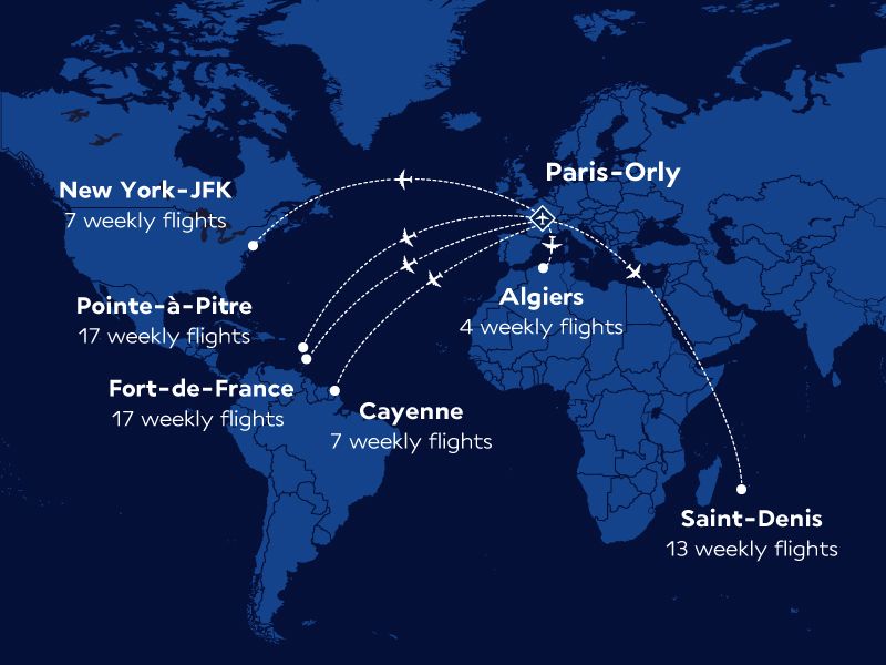 Podróżując liniami Air France do niektórych „wakacyjnych” destynacji, pasażerowie odlatują z lotniska Orly pod Paryżem. Między Orly, a głównym francuskim portem - Charles’a de Gaulle’a kursują regularne autobusy transferowe dla pasażerów zmieniających lotnisko (wymagany jest wcześniejszy odbiór bagażu). Z lotniska Orly, Air France oferuje loty do: Cayenne (Gujana), Fort-de-France (Martynika), Pointe-à-Pitre (Gwadelupa), St. Denis de la Réunion (Reunion), Nowego Jorku (JFK)* i Algieru (Algieria).