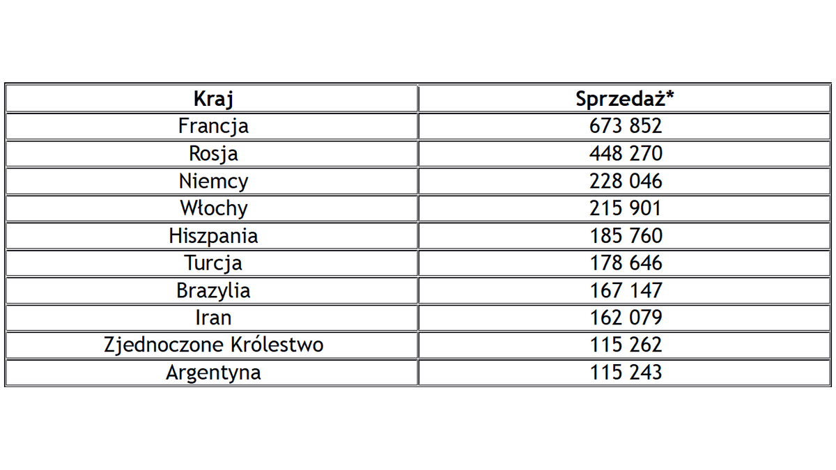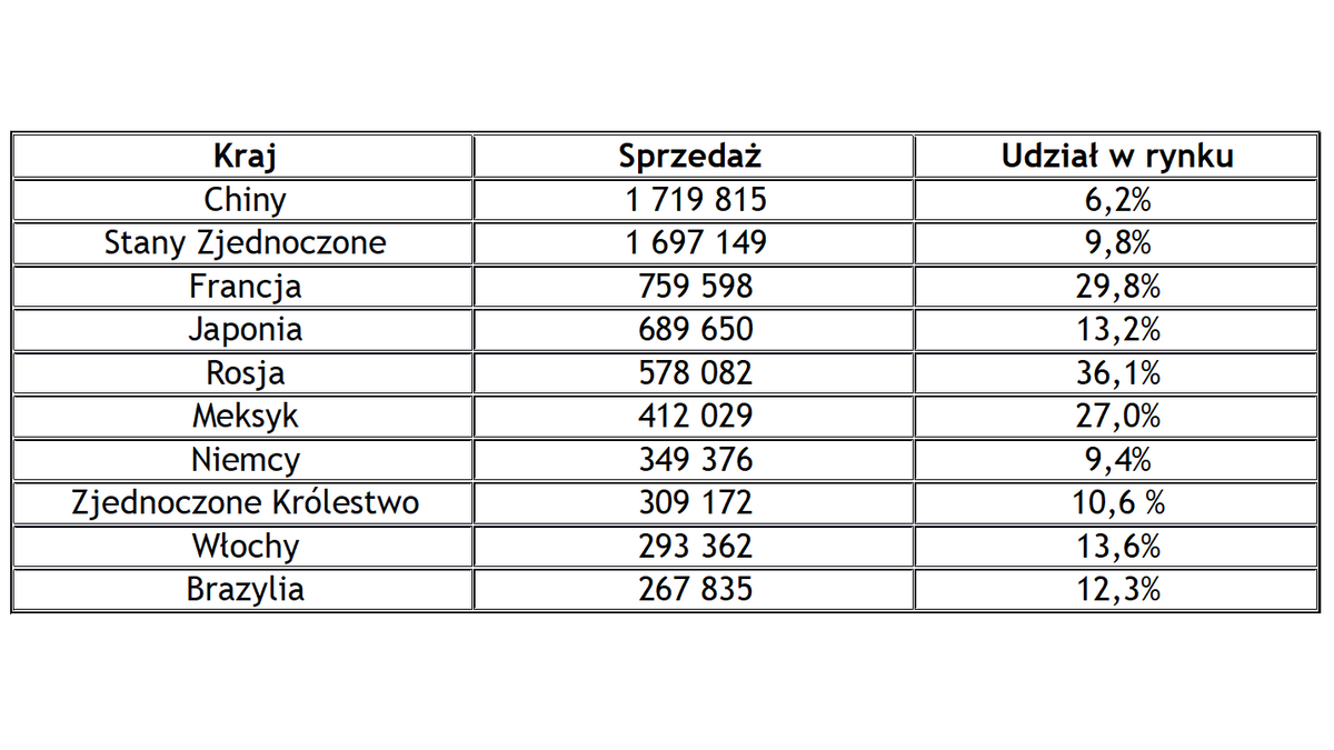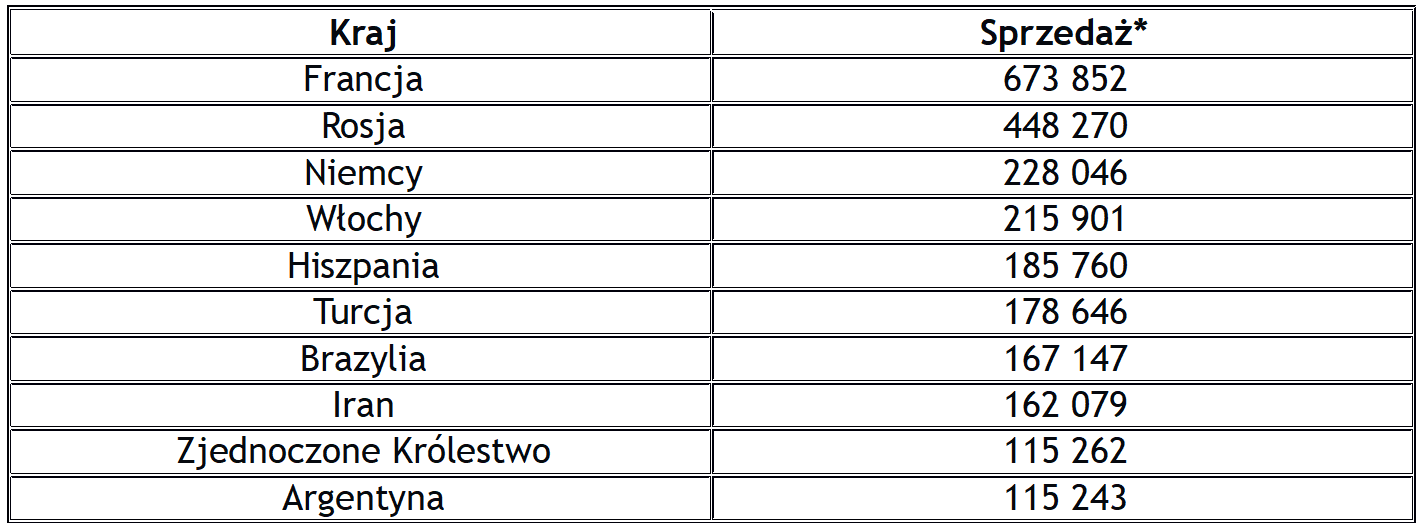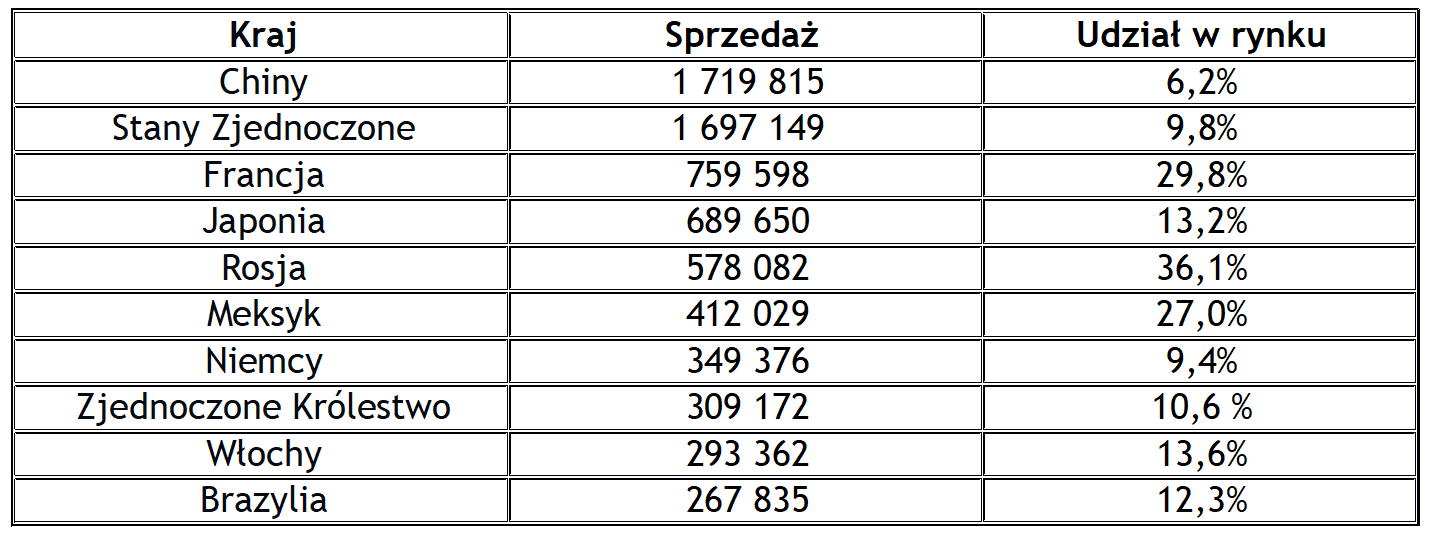 10 największych rynków zbytu Grupy Renault