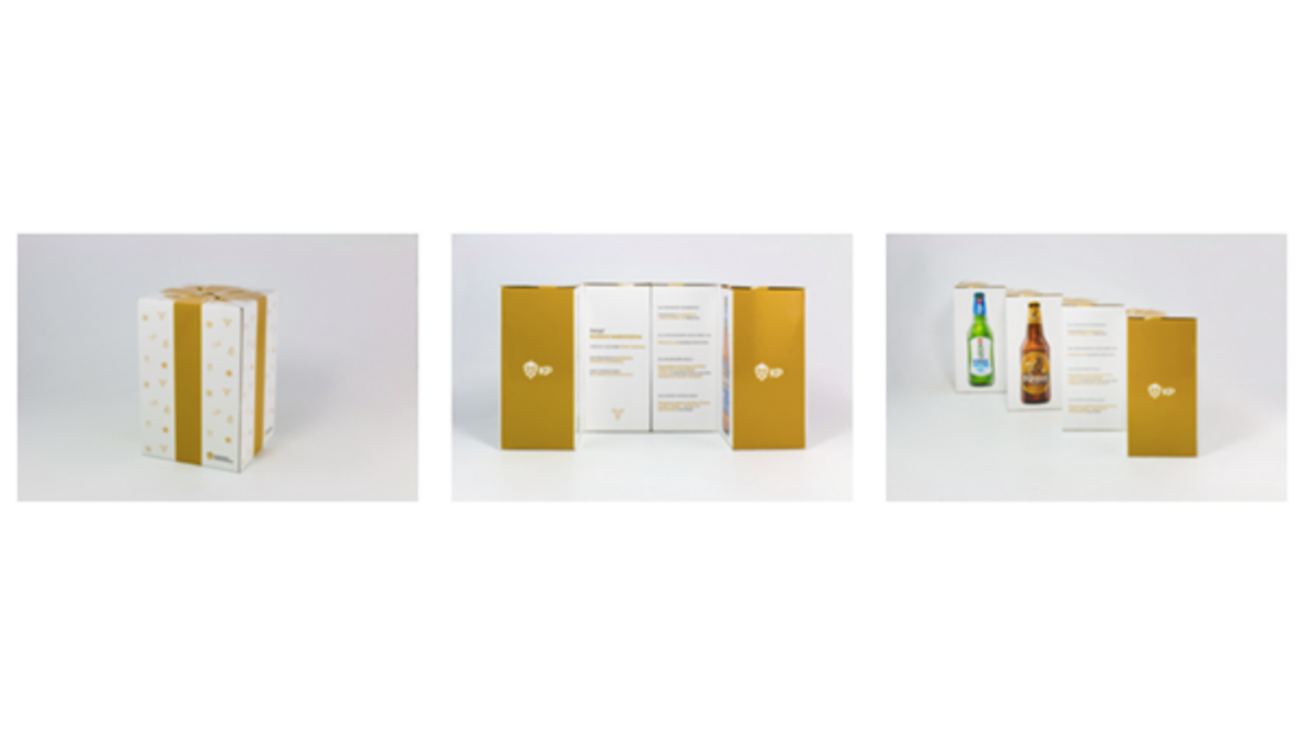 Kolejną ważną funkcją kofretu, powinna być funkcja transportowa. Pamiętajmy o tym, że nasz kofret trafia do punktu sprzedaży „zatowarowany”! Ogromnie ważne jest dobranie odpowiednich materiałów, tak aby trafił do klienta w nienaruszonym stanie. Samo zapewnienie stabilności produktów wewnątrz opakowania to niemałe wyzwanie. W przypadku lekkich produktów o regularnych kształtach sprawdzi się kartonowa wkładka z odpowiednio wyciętymi gniazdami na produkt. W przypadku produktów cięższych oraz takich, których ze względu na kształt nie przytrzyma gniazdo wycięte w kartonie stosuje się specjalne wypraski PET lub wytłoczki z pulpy papierowej, osłonięte dla efektu wizualnego kartonową maskownicą. Ale co w przypadku jeszcze cięższych produktów? Tu najczęściej sięgamy po tekturę falistą – odpowiednio przygotowany projekt, potrafi dać znakomity efekt. Przykładem takiej produkcji może być czteropak świąteczny KOMPANII PIWOWARSKIEJ z 2018 roku. Opakowanie na 4 butelki piwa (łączna waga ponad 2,5kg) zostało wyprodukowane na tekturze falistej kaszerowanej kartonem. Każda z butelek jest osadzona w swojej „ćwiartce”, dzięki czemu jest doskonale zabezpieczona w transporcie. Ciekawy design pozwala na złożenie w prostopadłościan, dodatkowo zabezpieczony magnesami neodymowymi dla stabilności. Takie pomysłowe rozwiązanie pozwala na zwiększenie powierzchni informacyjnej.