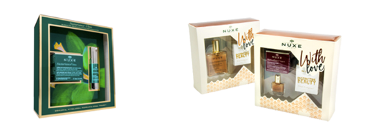 Oczywiście, najważniejszą z nich jest funkcja marketingowa - wiadomo, kupujemy (my, konsumenci) głównie „oczami”. Nasz produkt powinien wyróżniać się na półce – przyciągać wzrok kolorystyką lub kształtem, tak aby przykuł od razu uwagę klienta. W przypadku opakowań świątecznych możemy spodziewać się na półkach odcieni zieleni oraz czerwieni przyozdobionych złotem – tu ciekawym pomysłem może być odejście od tego szablonu i zastosowanie innej kolorystyki, lub zrezygnowanie z typowej świątecznej ornamentyki (bombki, choinka). Ciekawym przykładem jaki mogę podać z własnego podwórka są kofrety świąteczne kosmetyków NUXE – gdzie NUXE POLSKA stawia co roku na inną kolorystykę. Możemy tu zaobserwować bardzo subtelne motywy – takie jak wycięcia wokół okienka w kształcie gór, przyprószonych miedzianym hot-stampingiem. Na kolejnym zdjęciu widzimy kofret w klasycznych świątecznych barwach (zielono-złoty), pozbawiony natomiast graficznych akcentów świątecznych. Rozwiązanie takie powoduje, że klient w punkcie sprzedaży również po okresie świątecznym chętnie sięgnie po tak estetyczny produkt.