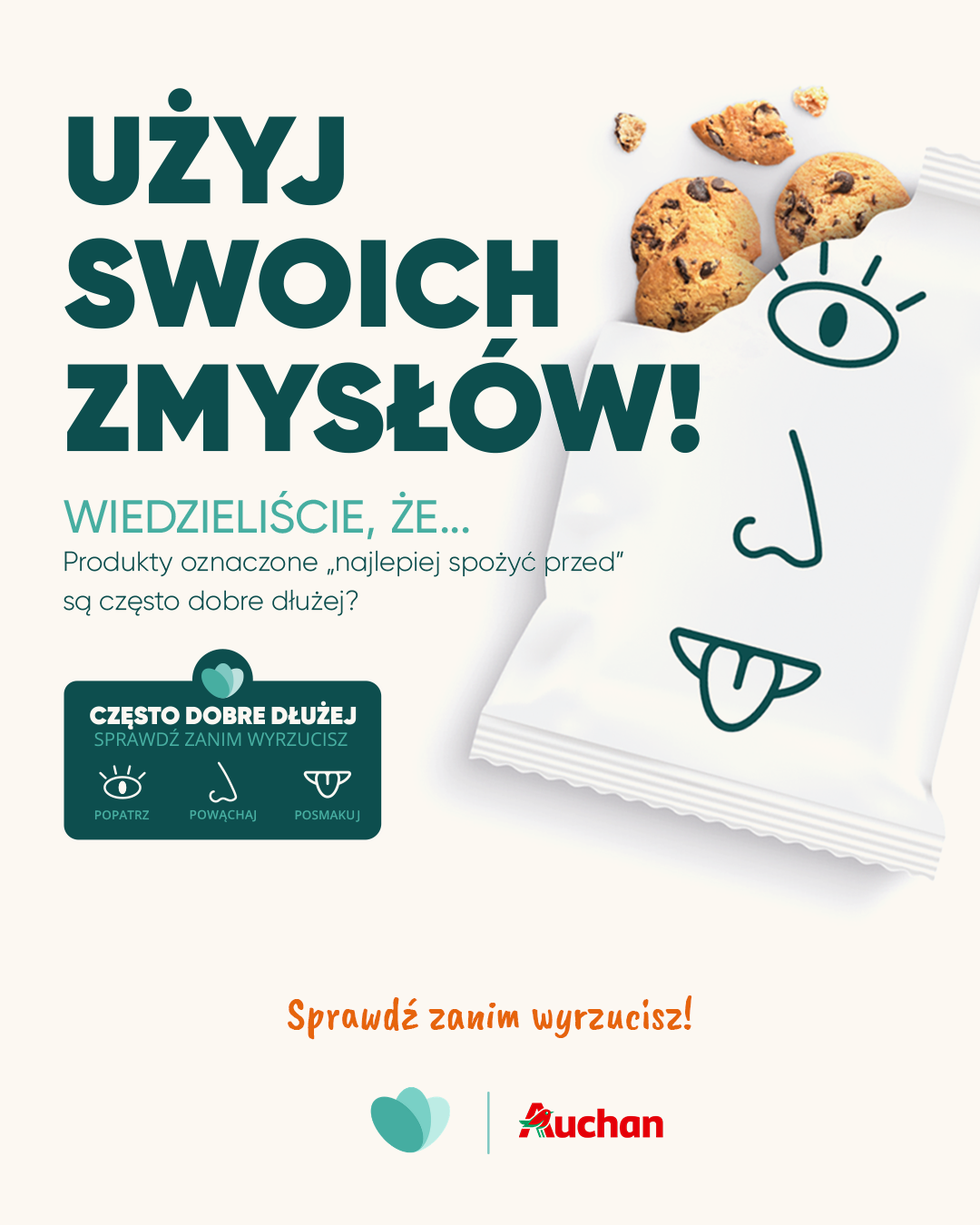 To stało się punktem wyjścia do prac nad kampanią Too Good To Go „Często Dobre Dłużej”, która właśnie została zainaugurowana (29 września). Firma znana z aplikacji przeciwdziałającej marnowaniu żywności razem z ulubionymi markami Polaków będzie szerzyć wiedzę z zakresu poprawnego czytania dat ważności, aby ograniczyć skalę zjawiska wyrzucania produktów na skutek ich niezrozumienia. To pierwsza tego typu kampania w Polsce realizowana na tak dużą skalę. W ramach akcji marka Auchan zobowiązała się do umieszczenia specjalnych plakatów opatrzonych hasłami Popatrz, Powąchaj, Posmakuj, które będą przypominać konsumentom, aby używali swoich zmysłów do podjęcia decyzji czy zjeść dany produkt po upływie terminu przydatności do spożycia.