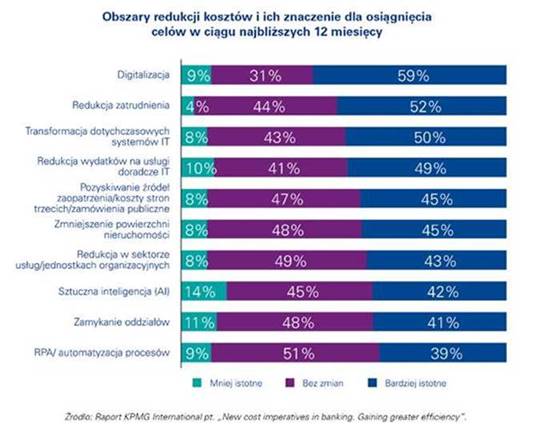 Wśród kluczowych narzędzi służących do redukcji kosztów respondenci z banków najczęściej wskazują cyfryzację (59% wskazań). Na drugim miejscu plasuje się redukcja zatrudnienia (52% wskazań) i transformacja dotychczasowych systemów IT (50% wskazań). Największe korzyści można osiągnąć poprzez automatyzację procesów i kompleksową cyfryzację w obszarze middle- i back-office, gdzie często nadal istnieje duże uzależnienie od nieefektywnych procesów wykonywanych w sposób manualny. Pozwala to również optymalizować zatrudnienie – redukcja pracochłonnych procesów opartych na dokumentach papierowych odciąża pracowników, którzy mogą skupić się na działaniach bardziej skoncentrowanych na kliencie. Jest to charakterystyczna cecha organizacji opartych na technologii cyfrowej, w które chcą się przekształcić banki poprzez wymianę i modernizację dotychczasowych platform IT.