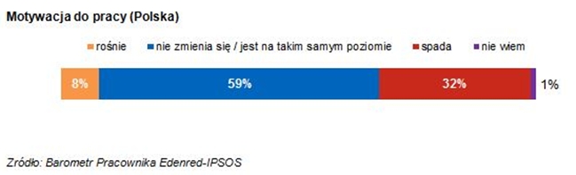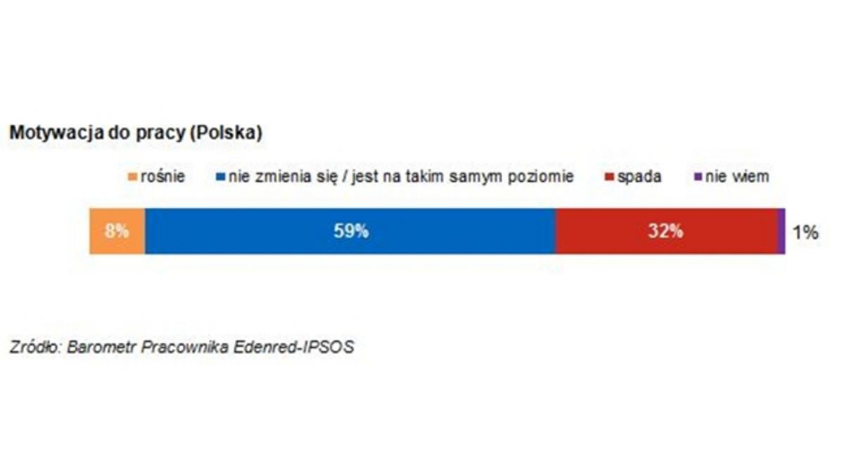 <p style="text-align: justify;">Aż 32 proc. pracowników w Polsce odczuwa spadek motywacji do pracy. Co trzeci badany kojarzy pracę z obowiązkiem i rutyną. Wśród pracowników z Europy Zachodniej dostrzega się niepokój o zatrudnienie i oczekiwanie od pracodawcy większej lojalności - wynika z badań przeprowadzonych przez firmę badawczą IPSOS na zlecenie Grupy Edenred.</p>