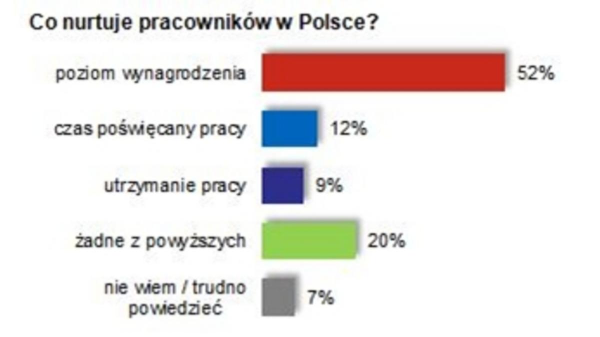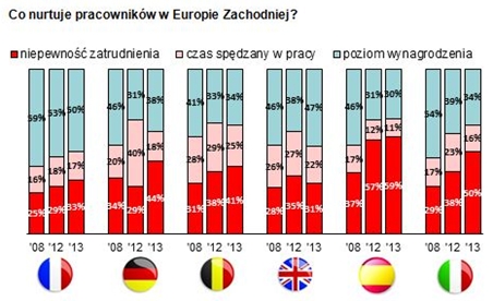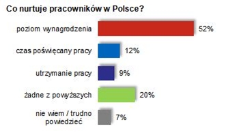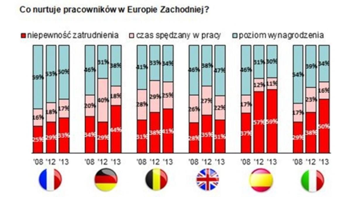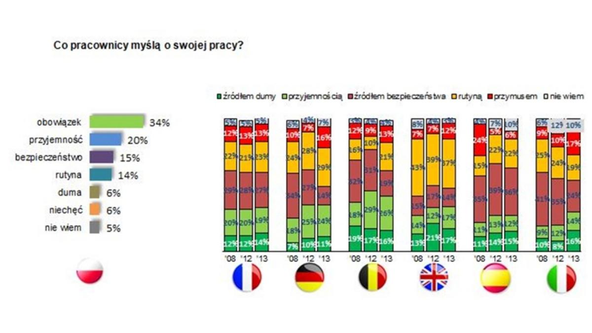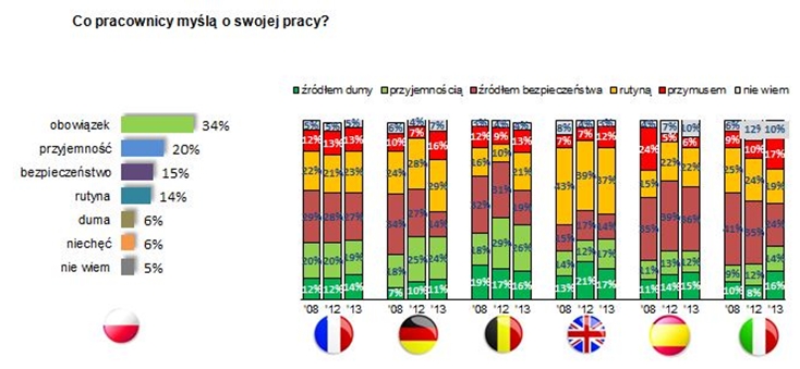 Co trzeciemu badanemu praca kojarzy się z obowi?zkiem – częściej mężczyznom niż kobietom. Ponad połowa badanych jest bardzo zaangażowana w swoj? pracę, mimo to, 1/3 odczuwa spadek motywacji do pracy. Obszary, z których respondenci s? najbardziej zadowoleni, to relacje z przełożonym i atmosfera w pracy. Natomiast działania firm, które najczęściej oceniane były, jako niewystarczaj?ce, dotycz? głównie zarz?dzania talentami, pakietu dodatkowych świadczeń dla pracowników oraz podnoszenia umiejętności zatrudnionych. W Europie Zachodniej, głównie w Niemczech, Belgii i Wielkiej Brytanii, praca kojarzy się z obowi?zkiem, rutyn?, a nawet brakiem źródła bezpieczeństwa. 38% respondentów z Francji twierdzi, że ich motywacja spada, co stanowi rekordowo wysoki odsetek wśród pozostałych krajów objętych badaniem. Oczekiwania pracowników hiszpańskich, włoskich i francuskich w stosunku do pracodawcy s? bardzo wysokie, w szczególności w zakresie zarz?dzania talentami. Model anglosaski jest pod tym względem bardziej oportunistyczny i opiera się na silnym zdystansowaniu zatrudnionych do pracodawcy.