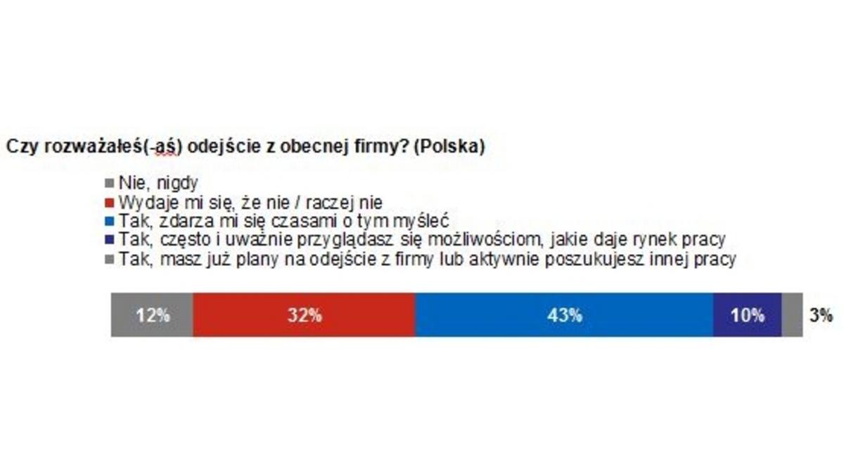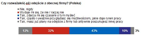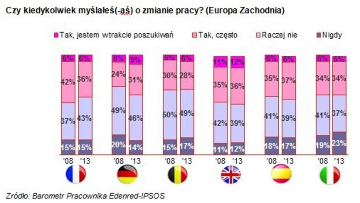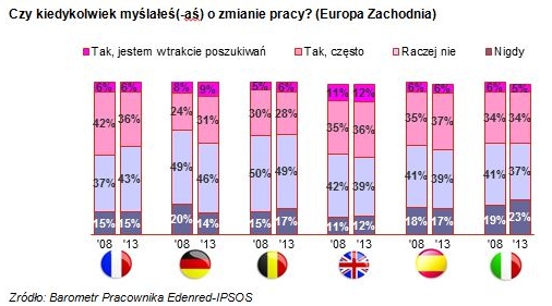 Tylko co czwarty badany optymistycznie patrzy na perspektywę łatwego znalezienia nowej pracy – częściej s? to mężczyźni i osoby do 34. r.ż. Zmianę pracy przynajmniej od czasu do czasu rozważa ponad połowa badanych, przy czym jedynie 3% badanych aktywnie jej poszukuje lub ma już konkretne plany. Główne czynniki, na które zwracaj? uwagę pracownicy podczas wyboru nowego pracodawcy, to oprócz poziomu wynagrodzenia (98%), dobra atmosfera w pracy (98%), stabilna sytuacja finansowa firmy (97%) oraz bezpieczeństwo zatrudnienia (97%). Dla badanych ważne jest również, aby praca była interesuj?ca i pozwalała na zachowanie work–life balance. Pracownicy z Europy Zachodniej s? bardziej lojalni wobec pracodawcy. 58% Francuzów, 60% Niemców i 66% Belgów deklaruje, że nie zamierza zmienić obecnej pracy.
