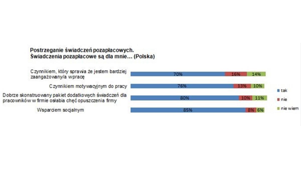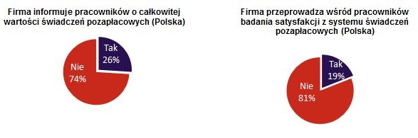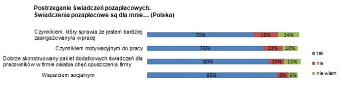 Co o działaniach podejmowanych przez firmy w obszarze motywacji myśl? sami pracownicy? Dla ponad 50% badanych s? one niewystarczaj?ce. Jednak w przedsiębiorstwach, gdzie pakiety motywacyjne s? obecne, zatrudnieni je dostrzegaj? i s? z nich raczej zadowoleni (59%). Pracownicy s? rzadko informowani o wartości otrzymywanych świadczeń, dlatego nie wiedz? jak wiele firma im oferuje. Praktyka ta występuje tylko w 26% firm w Polsce, częściej z kapitałem zagranicznym i zatrudniaj?cych powyżej 1000 pracowników. Zaledwie, co pi?ty badany, którego pracodawca oferuje jakikolwiek system motywacyjny, twierdzi, że w firmie przeprowadza się badania satysfakcji z otrzymywanych benefitów.