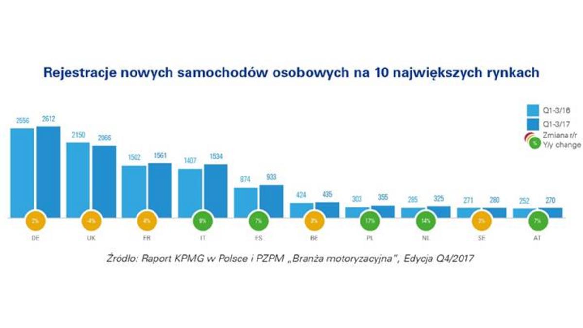 W Polsce odnotowano największy wzrost rejestracji samochodów osobowych spośród dziesięciu największych rynków w Unii Europejskiej (+17%). Na drugim miejscu znalazła się Holandia (+14%), a na trzecim Włochy (+9%). Liderami w tej kategorii niezmiennie pozostaj? Niemcy i Wielka Brytania.