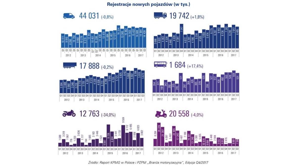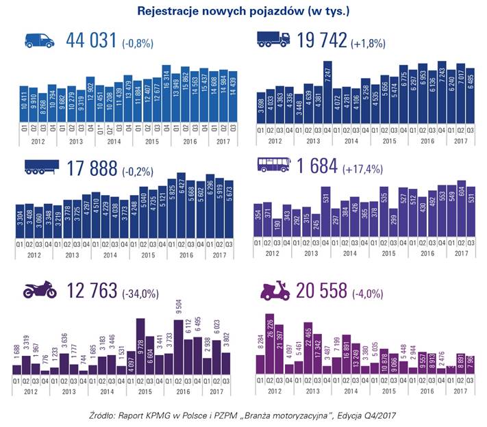 Raport kwartalny PZPM i KPMG w Polsce „Branża motoryzacyjna”, Edycja Q4/2017 należy do serii raportów kwartalnych, których celem jest przedstawienie bież?cych trendów w branży motoryzacyjnej w Polsce, rozumianej zarówno jako rynek motoryzacyjny, jak i produkcja przemysłowa oraz motoryzacyjne usługi finansowe. Analiza oparta jest o najnowsze dostępne dane rejestracyjne, statystyczne i rynkowe. Publikacja jest wspólnym przedsięwzięciem Polskiego Zwi?zku Przemysłu Motoryzacyjnego oraz KPMG w Polsce.
