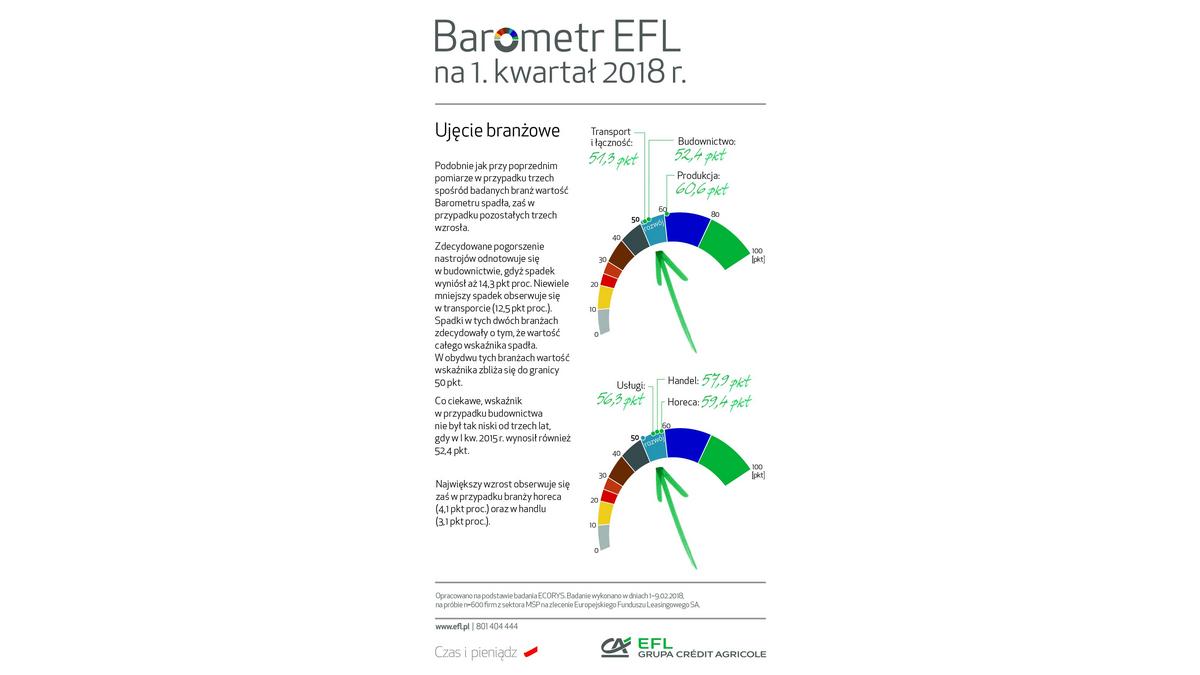 „Barometr EFL” jest syntetycznym wskaźnikiem informuj?cym o skłonności firm z sektora MŚP do wzrostu (tj. rozwoju rozumianego jako stawianie sobie przez przedsiębiorstwa celów zwi?zanych ze wzrostem sprzedaży i produkcji, ekspansj? na nowe rynki i maksymalizacj? zysków, co jest zwi?zane z inwestycjami w środki trwałe). Prognozowana na dany kwartał kondycja finansowa firm MŚP daje punkt odniesienia do wnioskowania o zakładanym kierunku zmian, które sprzyjaj? wzrostowi lub działaj? hamuj?co na rozwój firm. Badanie przygotowywane jest metod? CATI przez Ecorys na zlecenie EFL S.A., a jego wyniki s? publikowane co kwartał. W badaniu wzięła udział reprezentatywna grupa sześciuset mikro, małych i średnich firm z całej Polski. Aktualna edycja badania odbyła się w dniach 1 – 9 lutego 2018 r.