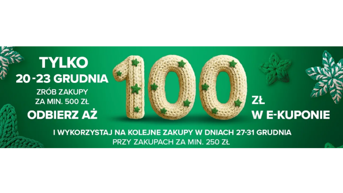 Realizacja e-kuponów rabatowych możliwa jest w dniach 27–31 grudnia 2025 r. przy jednorazowych zakupach o wartości minimum 250 zł, przy czym do wymaganej kwoty nie są wliczane te same grupy produktów wyłączonych z promocji.