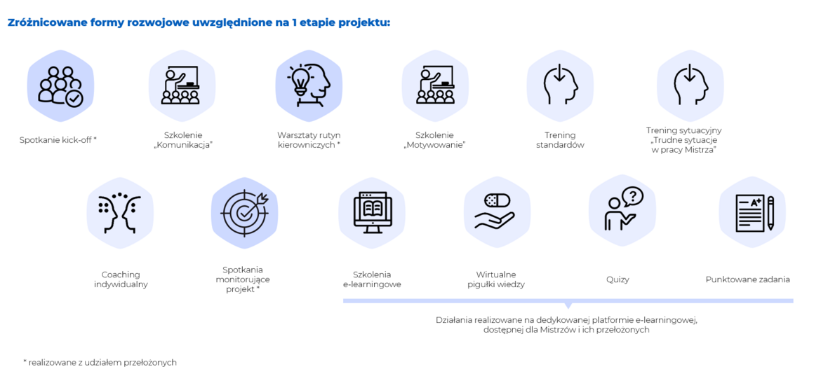 Projekt został podzielony na trzy etapy, a każdy z nich skupiał się wokół wybranych kompetencji przewodnich. Pierwszy etap poświęcono na rozwój „komunikacji” i „orientacji na rezultat”. Rozpoczęto od spotkania otwierającego projekt, w ramach którego Mistrzowie i ich przełożeni zapoznali się z założeniami projektu. Następnie Uczestnicy brali udział w szeregu działań rozwojowych, w tym: szkoleniach, warsztatach rutyn kierowniczych, treningach sytuacyjnych, coachingach indywidualnych i aktywnościach realizowanych na dedykowanej platformie e-learningowej. Najważniejszym efektem pierwszego etapu projektu było ujednolicenie i opracowanie rutyn kierowniczych w oparciu o sprecyzowane KPI. Te rutyny, które wiązały się z interakcją z pracownikami były przedmiotem treningu, który wsparł ich wdrożenie.