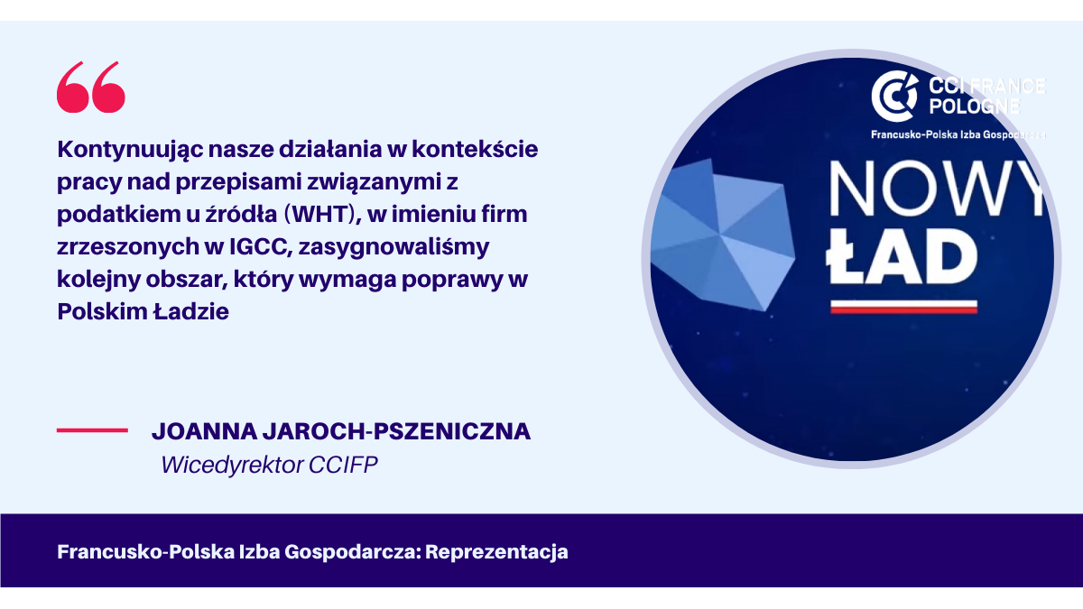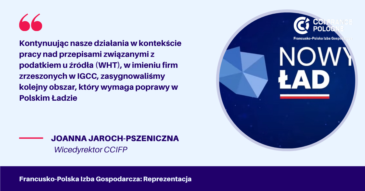 Kontynuując nasze działania w kontekście pracy nad przepisami związanymi z podatkiem u źródła (WHT), w imieniu firm zrzeszonych w IGCC, zasygnowaliśmy kolejny obszar, który wymaga poprawy w Polskim Ładzie. Monika Lewandowska z firmy CRIDO merytorycznie czuwa nad tematem WHT już od października 2018 roku.