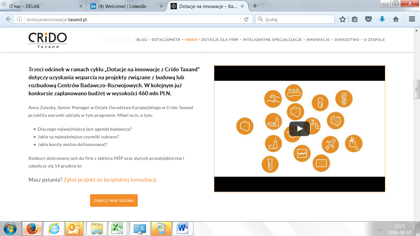 Więcej szczegółowych informacji dotycz?cych ww konkursu, jak również wielu innych można znaleźć na stronie dotacjenainnowacje.taxand.pl, gdzie zapraszamy do obejrzenia krótkiego filmu o tym, o czym powinni pamiętać przedsiębiorcy ubiegaj?cy się o wsparcie w ramach programu Centra B+R przedsiębiorstw.