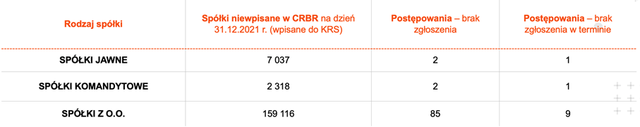 Tabela 2: Liczba postępowań wszczętych wobec podmiotów, które nie dokonały zgłoszenia lub nie dokonały go w terminie na przykładach spółki jawnej, spółki komandytowej oraz spółki z o.o. wg stanu na 31 grudnia 2021 r.