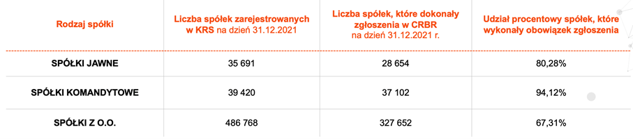 Tabela 1: Liczba podmiotów wpisanych do KRS oraz CRBR na przykładach spółki jawnej, spółki komandytowej oraz spółki z o.o. wg stanu na 31 grudnia 2021 r.