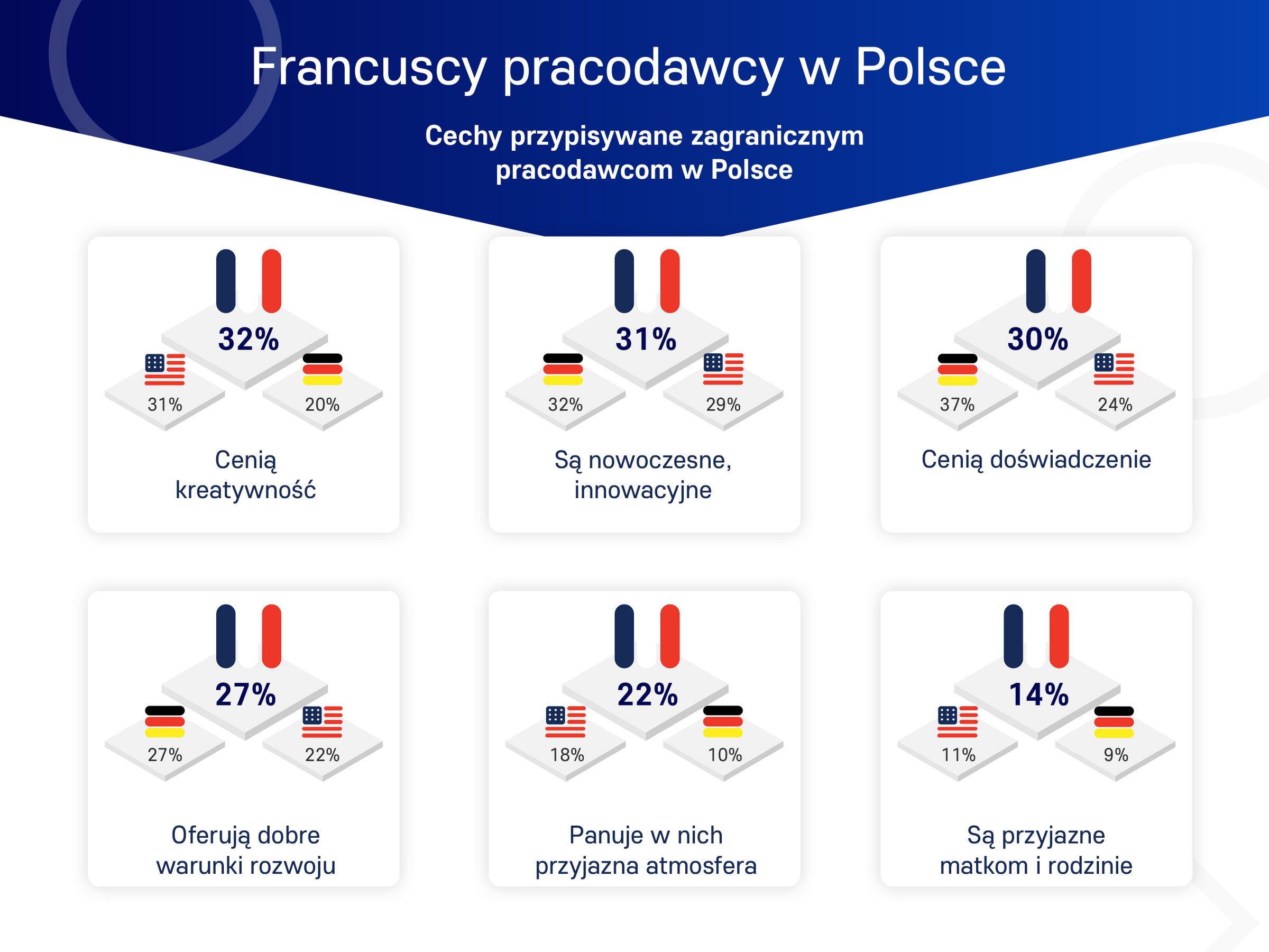 Zagraniczni pracodawcy w Polsce, w takich aspektach jak: innowacyjność, nowoczesność, dobre warunki rozwoju, czy atrakcyjne benefity uzyskali oceny na zbliżonym poziomie (różnica między Francuzami, Niemcami i Amerykanami nie przekraczała 5%). Można jednak wyróżnić obszary specyficzne dla danej narodowości. U Francuzów była to kreatywność, przyjazna atmosfera i sprzyjanie matkom i rodzinie. Firmy niemieckie w większym stopniu s? postrzegane jako stabilni pracodawcy na dłużej, oferuj?cy atrakcyjne wynagrodzenie. Amerykańskie przedsiębiorstwa s? doceniane najczęściej za kreatywność i nieformalny styl pracy.