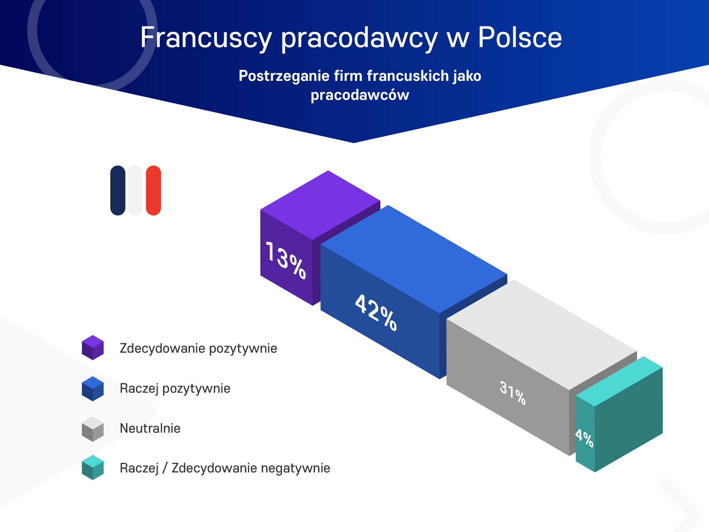 Jak pokazuj? wyniki badania przeprowadzonego w lipcu i sierpniu przez Nielsen Polska na reprezentatywnej próbie 1000 Polaków, blisko co drugi badany chciałby zatrudnić się w firmie zagranicznej, a jedynie co czwarty wybrałby firmę lokaln?. Dla 31% respondentów narodowość przedsiębiorstwa nie ma znaczenia. Jako pracodawcy firmy francuskie postrzegane s? pozytywnie przez ponad połowę Polaków, oceny negatywne deklaruje jedynie 4% respondentów. Największy odsetek pozytywnych odpowiedzi występuje wśród pracowników firm francuskich (blisko 65%), co pokazuje, że dobre opinie potwierdzaj? się wraz z doświadczeniami zdobytymi u francuskich pracodawców. Firmy znad Sekwany s? wybierane głównie ze względu na styl pracy (58% odpowiedzi), zainteresowanie kultur? tego kraju (44%), jak i oferowane przez nie warunki zatrudnienia (39%). Podobnie postrzegane s? firmy amerykańskie i niemieckie, które zostały pozytywnie ocenione przez odpowiednio 55% i 59% respondentów.