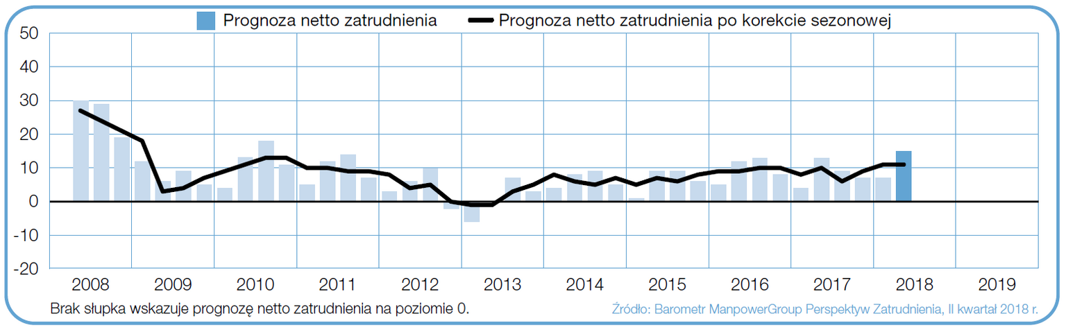 <p style="text-align: justify;">Prognoza netto zatrudnienia dla Polski po korekcie sezonowej wynosi +11%. Najkorzystniejsza sytuacja czeka poszukujących pracy w produkcji przemysłowej oraz w centralnej Polsce. W okresie kwiecień−czerwiec 2018 r. 18% firm chce zwiększać, a 3% zmniejszać zatrudnienie. Pozytywne deklaracje pracodawców odnotowano we wszystkich 10 badanych sektorach rynku oraz we wszystkich 6 analizowanych regionach kraju. Zobacz więcej w opublikowanym dziś raporcie Barometr ManpowerGroup Perspektyw Zatrudnienia.</p>