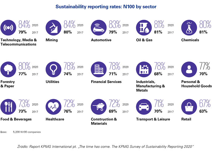 Jak wynika z badania KPMG, w 2020 r. ponad 70 proc. przedstawicieli wszystkich branż raportuje kwestie związane ze równoważonym rozwojem. Wyjątek stanowi sektor detaliczny, w którym ciągle mniej niż 70 proc. przedstawicieli zamieszcza w swoich sprawozdaniach kwestie dotyczące zrównoważonego rozwoju. Na prowadzeniu w tym roku znalazło się sześć sektorów, które również były w czołówce w poprzedniej edycji badania w 2017 r. Są to: sektor technologii informacyjnych, mediów i telekomunikacji (84 proc.), przemysł wydobywczy (84 proc.), branża motoryzacyjna (83 proc.), wydobycie ropy naftowej i gazu ziemnego (81 proc.), branża chemiczna (80 proc.) oraz przemysł leśno-drzewny (80 proc.).