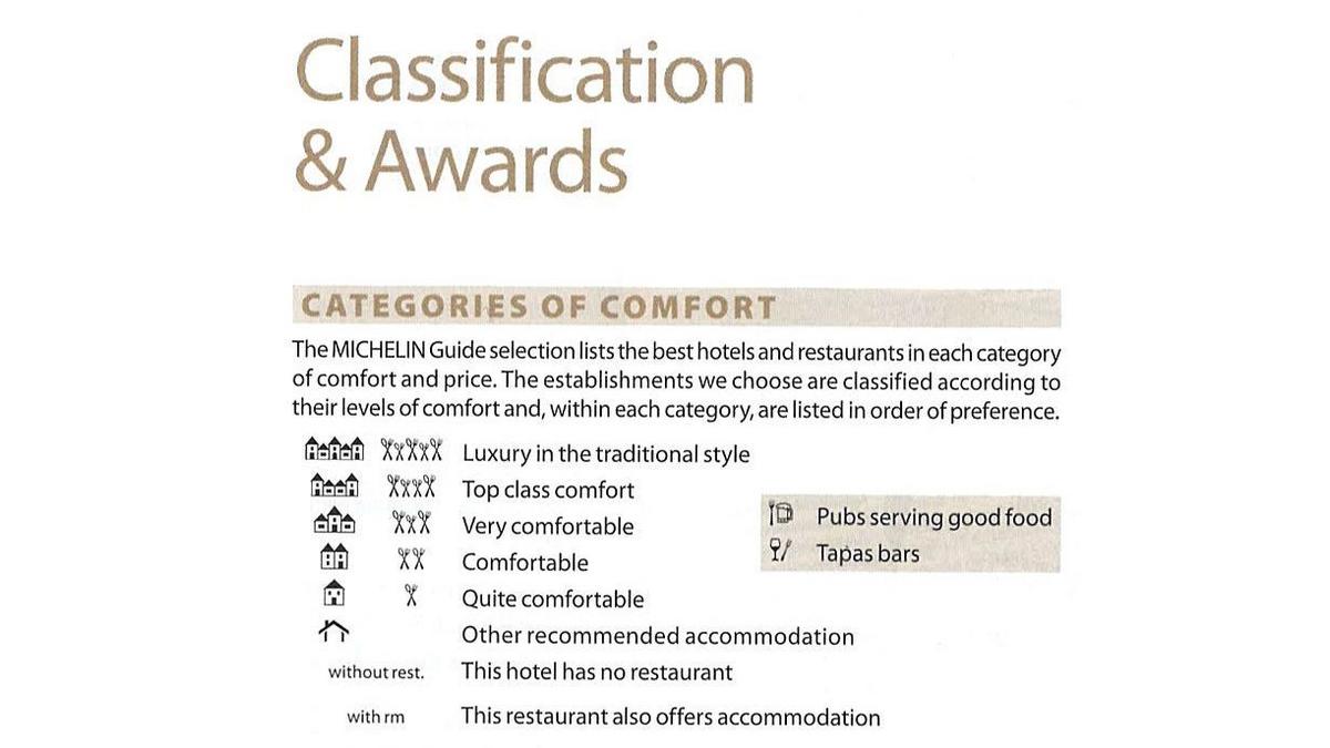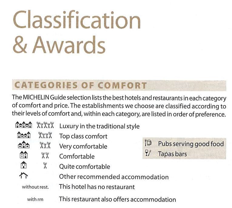 Najważniejszym wyróżnieniem, jakie w Czerwonym Przewodniku Michelin „Main Cities of Europe” może otrzymać restauracja, s? gwiazdki. Hotelom natomiast przyznawane s? piktogramy dużych budynków – poziom oferowanych usług określa skala od jednego do pięciu symboli. Dodatkowo inspektorzy mog? wyróżnić atmosferę panuj?c? w hotelu – miejsca szczególnie przyjemne i miłe oznaczone s? symbolami czerwonymi.