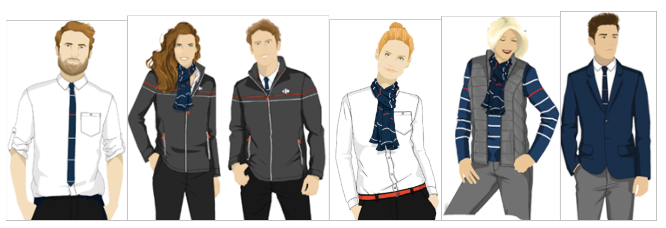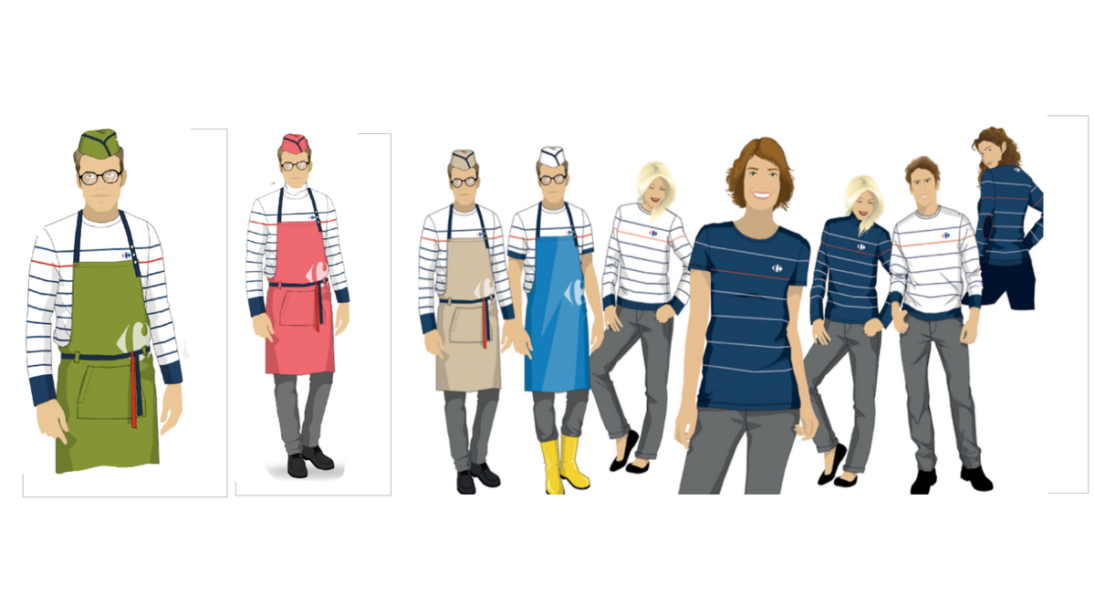 Po zapoznaniu się z kodem graficznym i wizerunkowym Carrefour, potrzebami pracowników i oczekiwaniami Zarz?du sieci, studio kreatywne MULLIEZ-FLORY przedstawiło kilka propozycji stylistycznych odzieży, spośród których jedna - bazuj?ca na stylu marinière (wg stylu marynarskiej bluzy w paski) - została wybrana przez Zarz?d firmy.