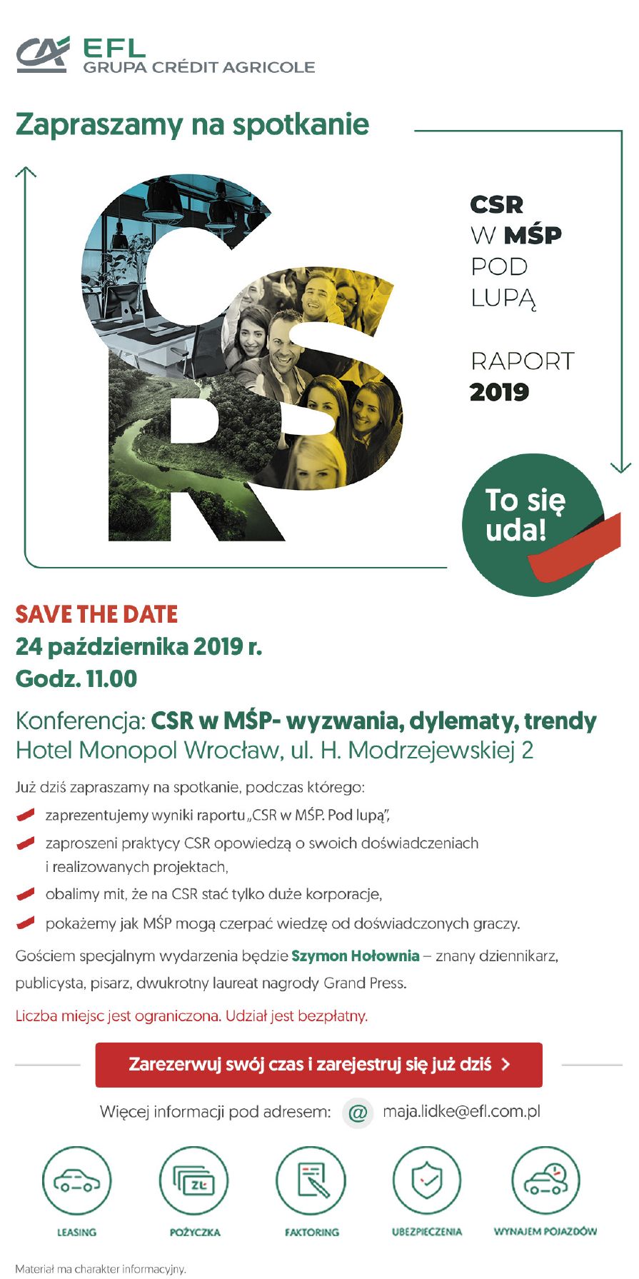 Mamy przyjemność zaprosić Państwa na bezpłatną konferencję „CSR w MŚP – wyzwania, dylematy, trendy”. Podczas spotkania zaprezentowane zostaną wyniki raportu „CSR w MŚP. Pod lupą”. Zaproszeni eksperci opowiedzą o swoich doświadczeniach i realizowanych projektach oraz obalą mit, że na CSR stać tylko duże korporacje. Opowiedzą jak MŚP mogą czerpać wiedzę od doświadczonych graczy. Gościem specjalnym wydarzenia będzie Szymon Hołownia znany dziennikarz, publicysty, pisarz, dwukrotny laureat nagrody Grand Press.