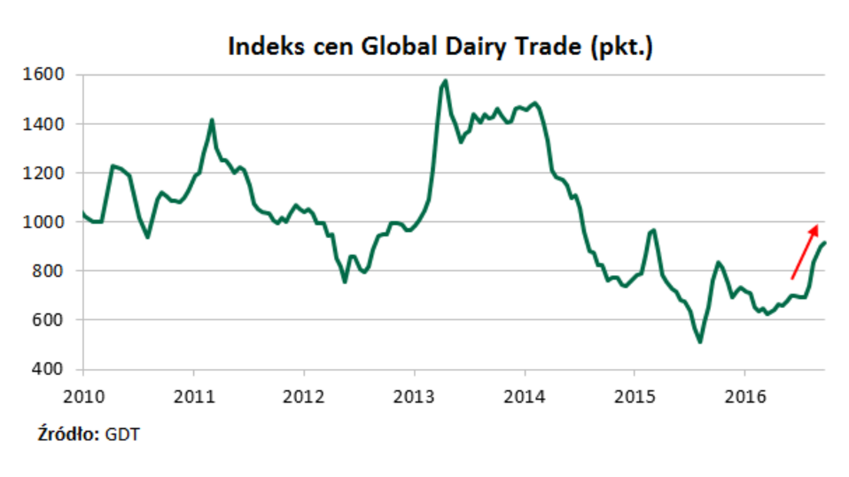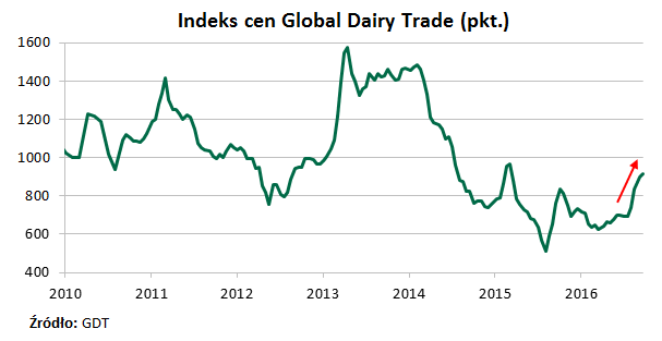 <p style="text-align: justify;">Wczoraj miała miejsce aukcja produktów mlecznych na platformie aukcyjnej Global Dairy Trade (GDT) w Nowej Zelandii. Indeks cen GDT zwiększył się na niej do 913 pkt. wobec 898 pkt. na poprzedniej aukcji, która miała miejsce 6 września br. (wzrost o 1,7%), co było poniżej oczekiwań rynku przybliżanych kontraktami terminowymi na pełne mleko w proszku, odtłuszczone mleko w proszku oraz masło odwodnione na giełdzie w Nowej Zelandii. Tym samym indeks cen GDT ukształtował się na najwyższym poziomie od marca 2015 r.</p>