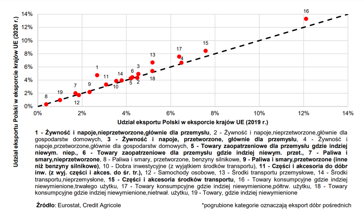 Z uwagi na trudną sytuację pandemiczną aktywności w poszczególnych segmentach eksportu Polski nie należy oceniać tylko bezpośrednio na podstawie jego tempa wzrostu, lecz również relatywnie na tle danych o handlu międzynarodowym w innych krajach UE. W tym celu obliczyliśmy udział eksportu Polski w łącznej wartości eksportu wszystkich krajów UE w różnych kategoriach wg klasyfikacji BEC w 2019 r. i 2020 r. Jeśli te odsetki zwiększyły się, to znaczy, że Polska radziła sobie relatywnie lepiej w handlu w danej grupie towarowej niż pozostałe kraje UE. Tendencje w tym zakresie przedstawiliśmy na wykresie. W kategoriach eksportu znajdujących się powyżej przerywanej linii udział Polski w całym eksporcie UE w 2020 r. zwiększył się względem 2019 r. Można zauważyć, że odsetki te zwiększyły się prawie we wszystkich segmentach eksportu. Wyjątkiem były żywność i napoje, nieprzetworzone, głównie dla gospodarstw domowych (nr 2 na wykresie), paliwa i smary, przetworzone, benzyny silnikowe (8 i 9), samochody osobowe (12) i towary gdzie indziej nie wymienione (19).