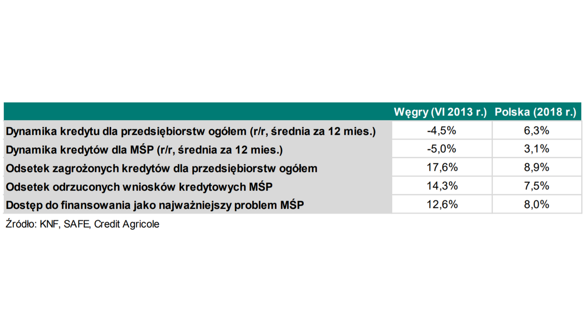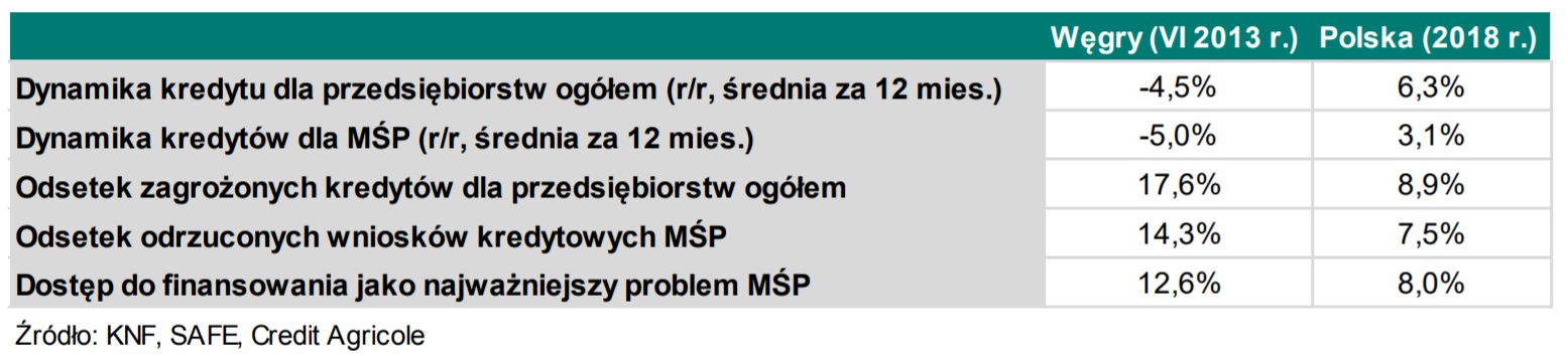 Obecnie Polska znajduje się w innej sytuacji niż Węgry w momencie wprowadzenia programu FGS (VI 2013 r., por. tabela). Akcja kredytowa w sektorze MŚP utrzymuje się na niskim poziomie (średnio 3,1% r/r za ostatnie 12 miesięcy), jednak nie obserwujemy spadku wolumenu kredytów. Ponadto udział kredytów zagrożonych w portfelu kredytów korporacyjnych ogółem (8,9%) jest wyraźnie niższy niż wówczas na Węgrzech (17,6%). Ponadto polskie firmy sektora MŚP nie maj? problemu z uzyskaniem finansowania. Zgodnie z badaniem SAFE realizowanym przez EBC i Komisję Europejsk? tylko 8,0% firm MŚP wskazuje obecnie na dostęp do finansowania jako najważniejszy problem w funkcjonowaniu przedsiębiorstwa i tylko 7,5% wniosków o kredyt bankowy zostaje odrzuconych. Należy jednak pamiętać, że w warunkach istotnego, przedłużaj?cego się spowolnienia wzrostu gospodarczego w Polsce ww. wskaźniki mog? ulec znacz?cemu pogorszeniu. Wtedy implementacja programu nisko oprocentowanego finansowania mogłaby być uzasadniona.