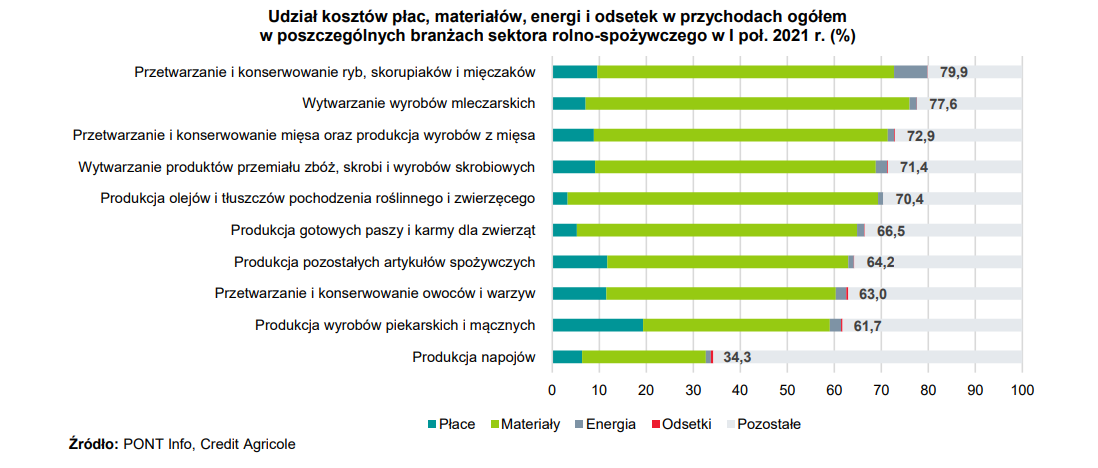 Sektor rolno-spożywczy zmaga się obecnie z silną presją kosztową wynikającą z rosnących cen materiałów, energii, pracy oraz kosztów odsetek od kredytów. Przedmiotem poniższej analizy jest ocena odporności poszczególnych branż polskiego sektora rolno-spożywczego na wyższe koszty działalności.