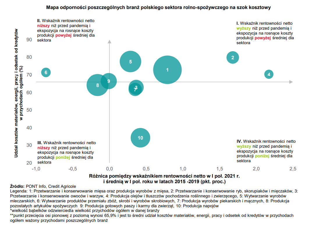 Najbardziej wyeksponowane na szok kosztowy są branże znajdujące się w II ćwiartce układu współrzędnych: „Wytwarzanie produktów przemiału zbóż, skrobi i wyrobów skrobiowych” oraz „Produkcja gotowych paszy i karmy dla zwierząt”. Wynika z tego, że są one osłabione po pandemii, a jednocześnie udział kosztów materiałów, energii, pracy i odsetek od kredytów w ich przychodach ogółem jest relatywnie wysoki na tle całego sektora. Najwyższą odpornością na szok kosztowy charakteryzują się z kolei branże z IV ćwiartki: „Produkcja napojów”, „Przetwarzanie i konserwowanie owoców i warzyw” oraz „Produkcja wyrobów piekarskich i mącznych”. Ich bieżąca sytuacja jest lepsza niż przed pandemią i jednocześnie udział wspomnianych wyżej kosztów w ich przychodach ogółem jest niższy na tle całego sektora. W sytuacji pośredniej są branże z I i III ćwiartki. Branże z I ćwiartki: „Przetwarzanie i konserwowanie mięsa oraz produkcja wyrobów z mięsa”, „Przetwarzanie i konserwowanie ryb, skorupiaków i mięczaków”, „Produkcja olejów i tłuszczów pochodzenia roślinnego i zwierzęcego”, „Wytwarzanie wyrobów mleczarskich” z jednej strony osiągają rentowność wyższą niż przed pandemią, z drugiej strony udział kosztów materiałów, energii, pracy i odsetek od kredytów w ich przychodach ogółem jest relatywnie wysoki na tle całego sektora. Z kolei jedyna branża z III ćwiartki („Produkcja pozostałych artykułów spożywczych”) z jednej strony charakteryzuje się niższym na tle sektora udziałem kosztów materiałów, energii, pracy i odsetek od kredytów w przychodach ogółem, z drugiej strony jej sytuacja finansowa jest obecnie gorsza niż przed pandemią.