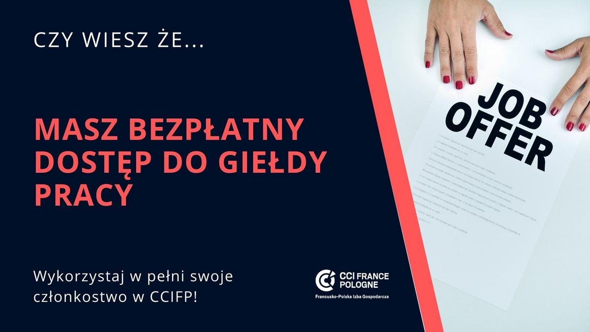 Giełda Pracy umożliwia publikowanie ofert pracy przez firmy stowarzyszone całkowicie BEZPŁATNIE! Ogłoszenia widoczne są dla wszystkich użytkowników odwiedzających stronę CCIFP lub logujących się do Strefy Członkowskiej.