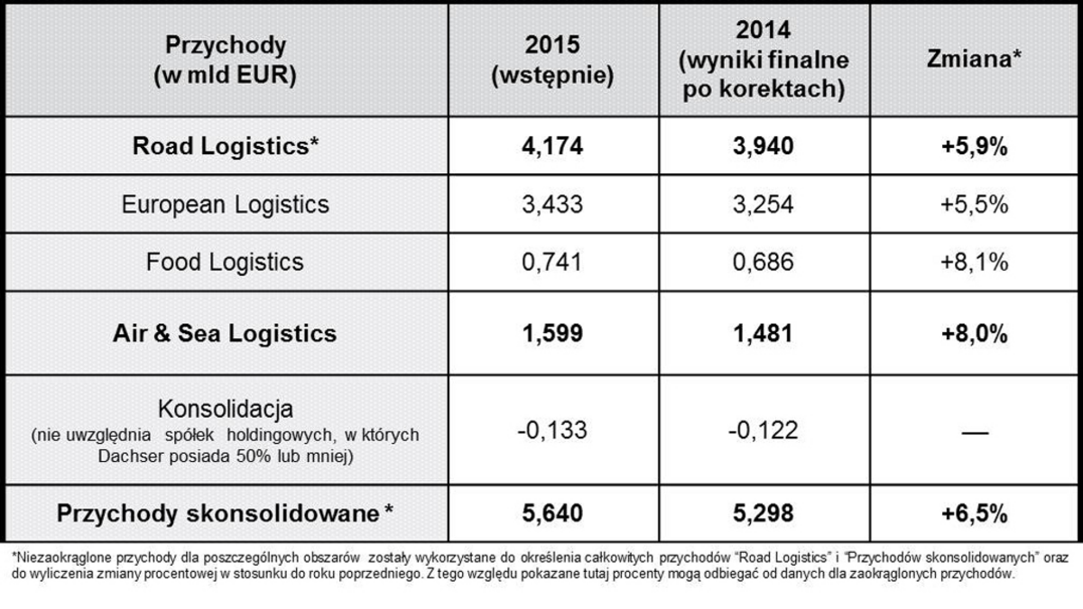 <p style="text-align: justify;"><strong>Dachser, jeden z największych operatorów logistycznych na świecie, zaraportował znaczny wzrost za 2015 r. Skonsolidowane przychody wzrosły o 6,5% do 5,64 mld euro. Liczba przewożonych przesyłek zwiększyła się o 4% do 78,1 mln, zaś ich waga o 5,2% do 37,3 mln ton. Największy wpływ na pozytywne wyniki miały usługi przewozów drogowych w Europie świadczone na rzecz branży spożywczej i firm przemysłowych.</strong></p>