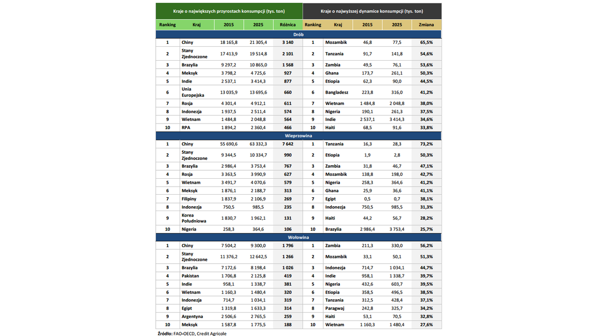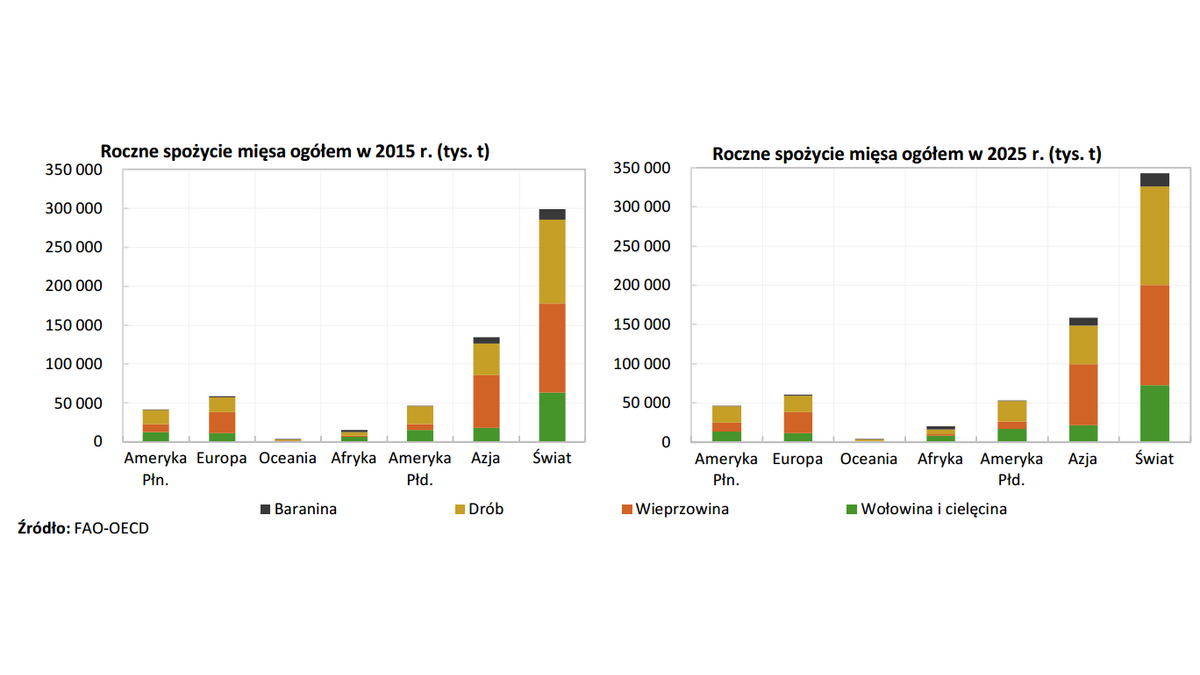 Zgodnie z projekcjami FAO i OECD konsumpcja mięsa w latach 2015-2025 zwiększy się o 14,5%. Głównym źródłem jej wzrostu będzie wyższe spożycie drobiu (+16,6%). W efekcie jego udział w strukturze światowej konsumpcji mięsa zwiększy się z 36,1% w 2015 r. do 36,8% w 2025 r. Spożycie najpopularniejszego gatunku mięsa na świecie, jakim jest obecnie wieprzowina, będzie rosło wolniej niż spożycie mięsa ogółem (+11,3%). W efekcie jego udział w strukturze spożycia mięsa na świecie zmniejszy się z 37,7% do 36,6%. Najsilniejszy ilościowy przyrost spożycia mięsa nast?pi w Azji, podczas gdy jego najwyższa dynamika zostanie odnotowana w Afryce. Wynika to ze zwiększaj?cej się populacji w krajach azjatyckich i afrykańskich przy jednoczesnym wzroście zamożności tamtejszych społeczeństw. W kontekście decyzji polskich eksporterów dotycz?cych kierunków ekspansji na szczególn? uwagę zasługuj? kraje charakteryzuj?ce się zarówno wysokim tempem wzrostu spożycia mięsa, jak i jego wysokim bezwzględnym przyrostem.