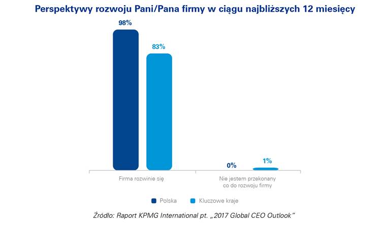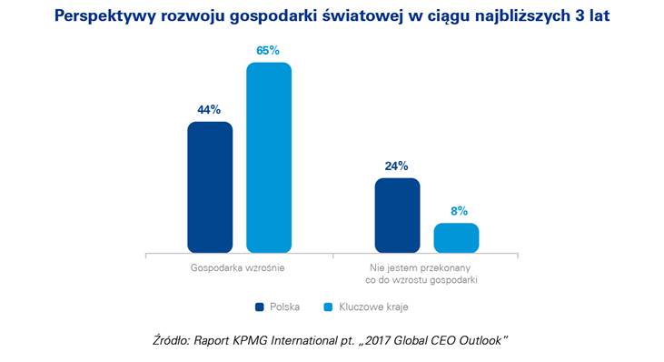 Jak wynika z najnowszego raportu KPMG International, ponad 8 na 10 prezesów spółek globalnych i niemalże wszyscy prezesi z Polski s? pewni perspektyw rozwoju swojej działalności w perspektywie najbliższego roku. Bior?c pod uwagę niestabilność zwi?zan? z globalnym wzrostem gospodarczym, 65 proc. zarz?dzaj?cych globalnymi spółkami jest przekonanych o dobrych perspektywach rozwoju światowej gospodarki w ci?gu kolejnych 3 lat. Jest to spadek o 15 p.p. w porównaniu do ubiegłorocznej edycji badania. W tej kwestii prezesi z Polski wykazuj? jeszcze mniejszy optymizm, tylko 44% jest pewnych pozytywnych wskaźników światowej gospodarki w kolejnych latach.