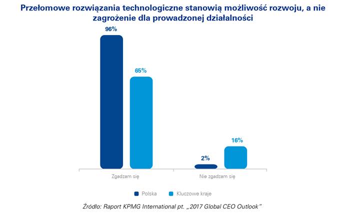 Ponad 6 na 10 prezesów globalnych spółek (65 proc.) twierdzi, że przełomowe rozwi?zania technologiczne stanowi? możliwość rozwoju, a nie zagrożenie dla prowadzonej przez nich działalności. W Polsce prawie każdy prezes (96 proc.) chce budować przewagę konkurencyjn? swojego przedsiębiorstwa w oparciu o nowoczesne rozwi?zania technologiczne, 98 proc. deklaruje, że aktywnie wdraża przełomowe rozwi?zania w swoim sektorze.