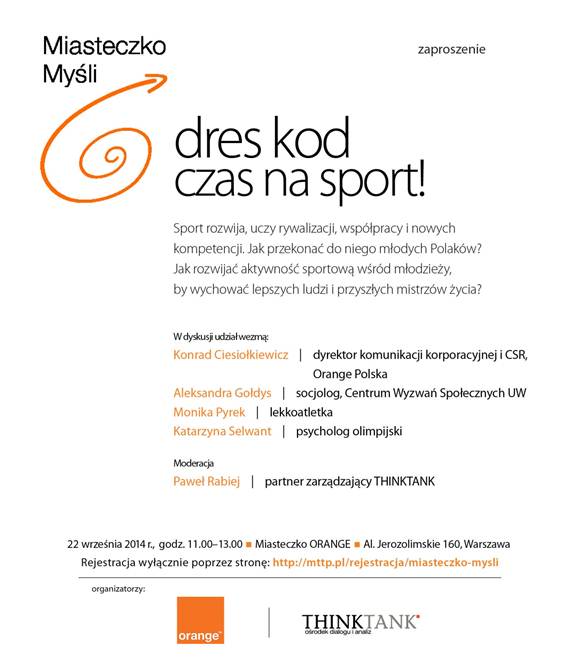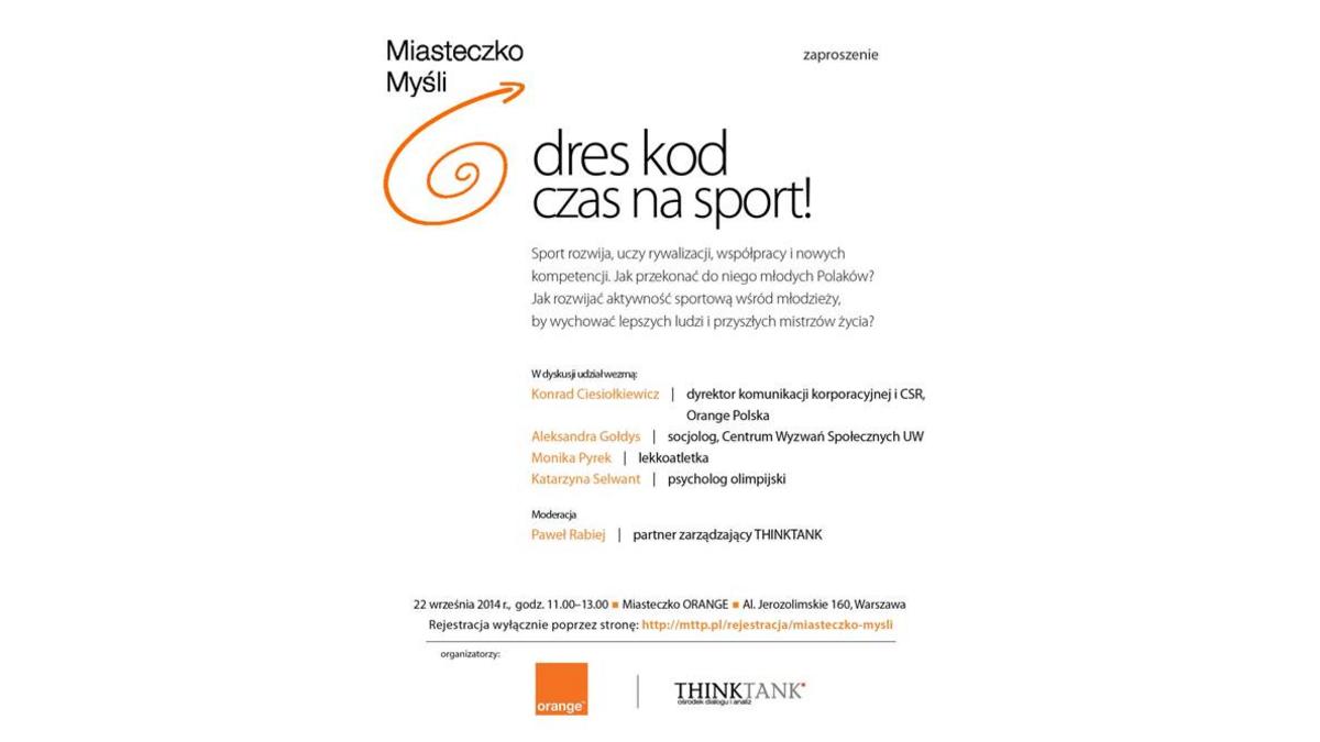 <p style="text-align: justify;">Serdecznie zapraszamy na spotkanie Orange Polska oraz ośrodka dialogu i analiz THINKTANK pt. „Dres kod – czas na sport!”. To druga debata organizowana w ramach cyklu Miasteczko Myśli. Miasteczko Myśli to miejsce publicznych debat na najważniejsze tematy. Wraz z ekspertami chcemy dzielić się doświadczeniami i korzystać z doświadczeń innych.</p>