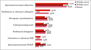 Jak wynika z badania PwC, najczęstszym przestępstwem była kradzież maj?tku wskazana przez 72% przedsiębiorców, która w porównaniu z badaniem z 2011 roku wzrosła o ponad 11%. Na drugim miejscu znalazły się nadużycia w obszarze zakupów (33% wskazań), a na kolejnych pozycjach zestawienia uplasowała się korupcja i przekupstwo (21%), cyberprzestępczość (19%) oraz manipulacje księgowe (19%).