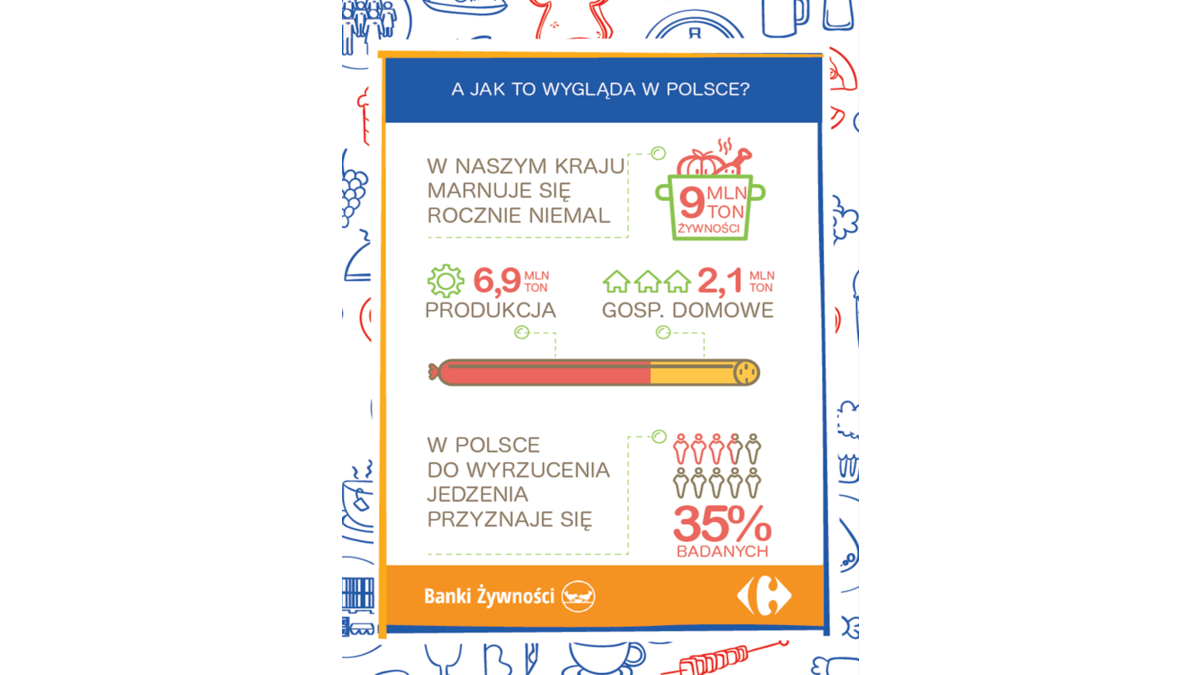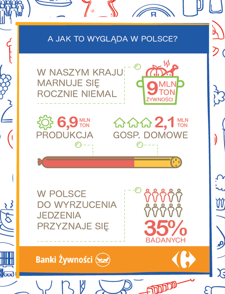 Carrefour od pocz?tku swojej działalności w Polsce, czyli od 1997 roku, współpracuje z Federacj? Polskich Banków Żywności, realizuj?c liczne inicjatywy maj?ce na celu przeciwdziałanie marnotrawstwu żywności. W 2015 roku Carrefour sformalizował swoje działania i podpisał ogólnopolsk? umowę z Federacj? Polskich Banków Żywności, reguluj?c? kwestie przekazywania produktów spożywczych. Na terenie całego kraju hipermarkety i supermarkety Carrefour przekazuj? regularnie produkty spożywcze do Banków Żywości. Ponadto, Carrefour co roku wspiera ogólnopolskie zbiórki żywności, udostępniaj?c przestrzeń i promuj?c zbiórki na terenie sklepu i w mediach.